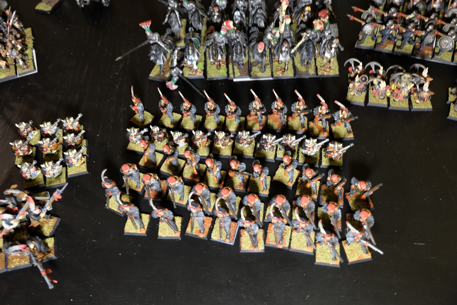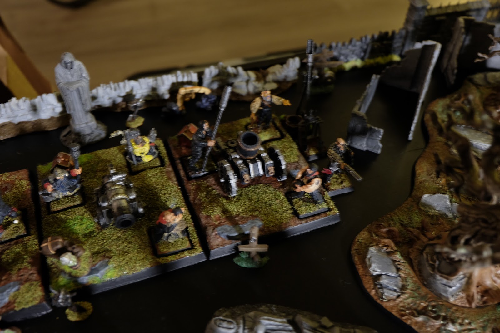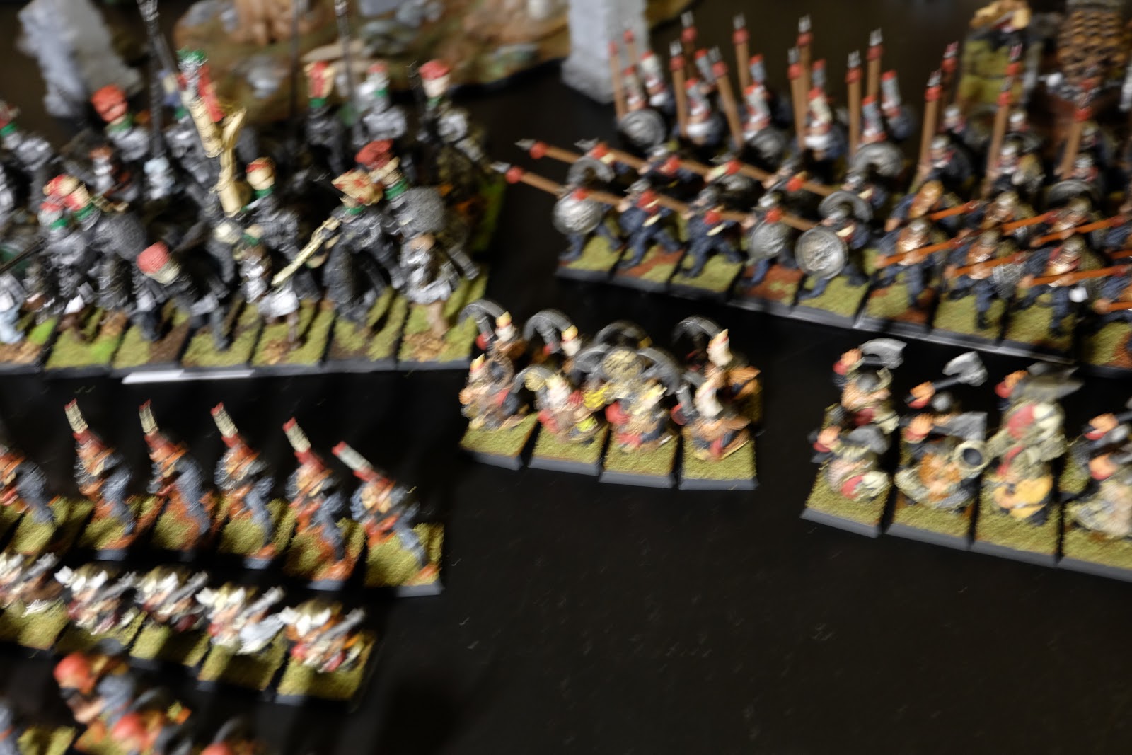 It\’s been a while since I got out my Nuln figures and while I have still not painted all the figures I own, I have made a good dent into the plastic here. Recently I have been in a frame of mind where I want to work on rank and file figures so I thought it was a good time to get the army out, sit and admire it a bit and most importantly take some photos for you folks. I am also going to get cracking on a few more figures to help bolster the ranks. Laying it all out, along with some of my more accessible terrain, I noticed that I have in fact rather more than I had ever expected. Sadly after getting it all out, the light was getting pretty low and so unfortunately the images are rather blurry: