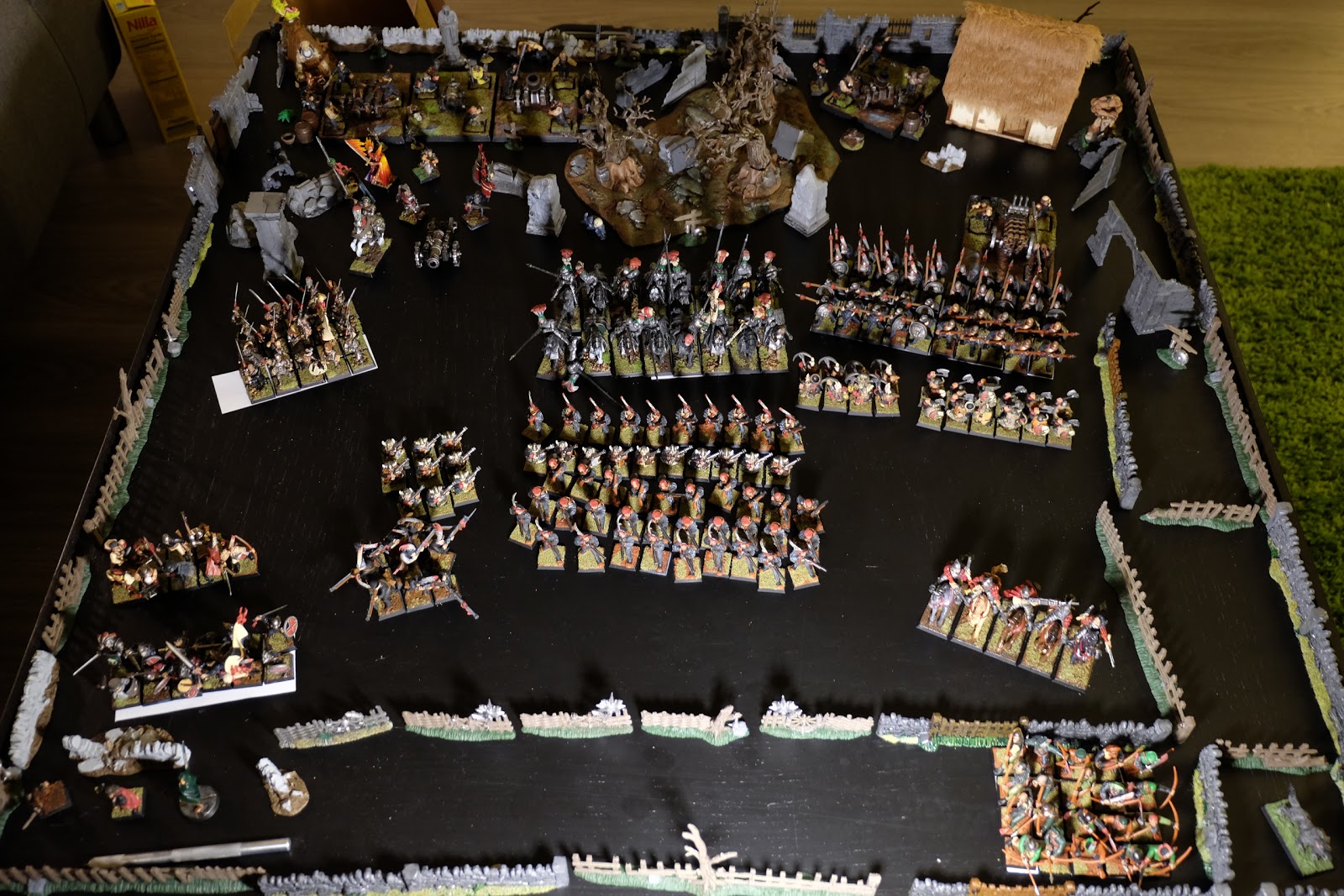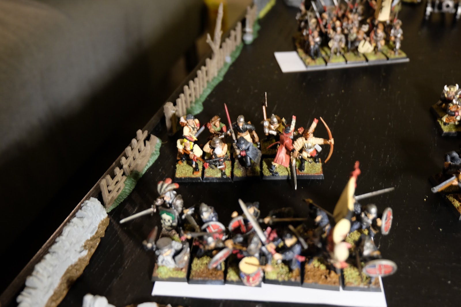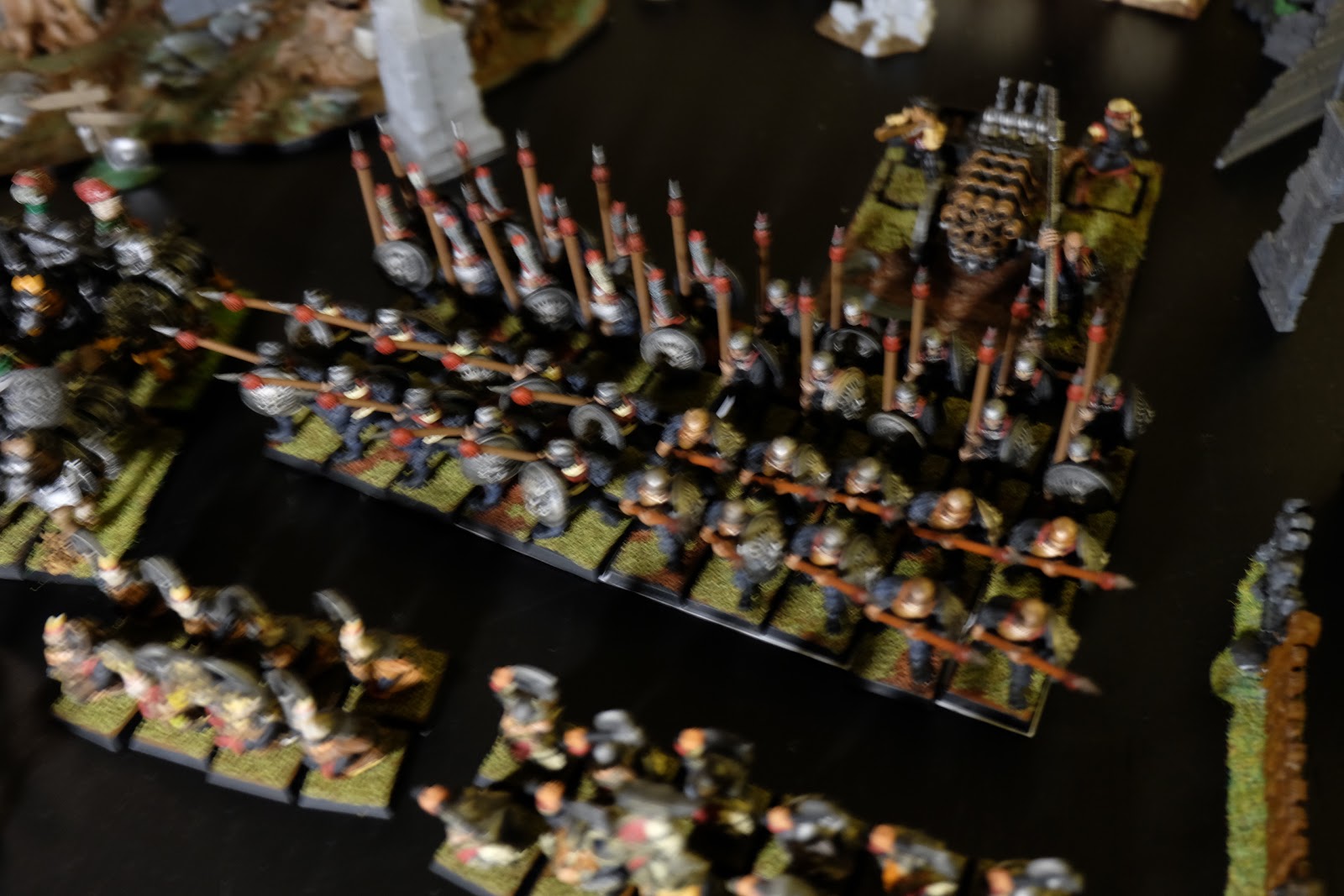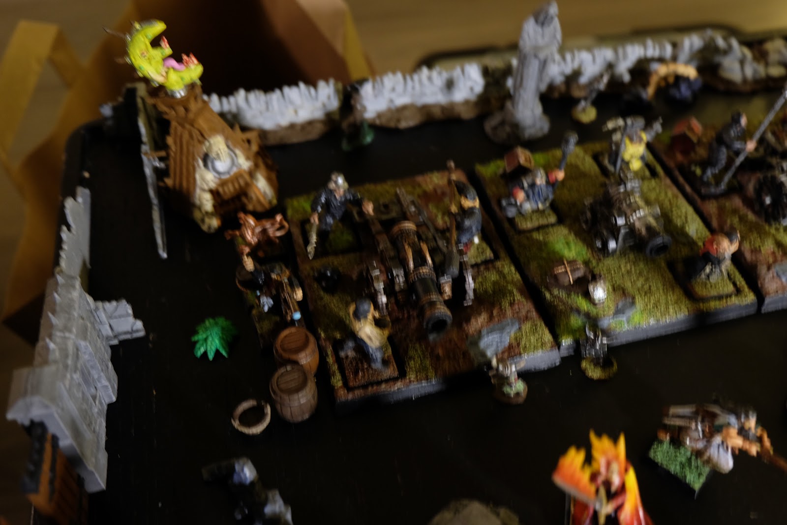 It\’s been a while since I got out my Nuln figures and while I have still not painted all the figures I own, I have made a good dent into the plastic here. Recently I have been in a frame of mind where I want to work on rank and file figures so I thought it was a good time to get the army out, sit and admire it a bit and most importantly take some photos for you folks. I am also going to get cracking on a few more figures to help bolster the ranks. Laying it all out, along with some of my more accessible terrain, I noticed that I have in fact rather more than I had ever expected. Sadly after getting it all out, the light was getting pretty low and so unfortunately the images are rather blurry:
