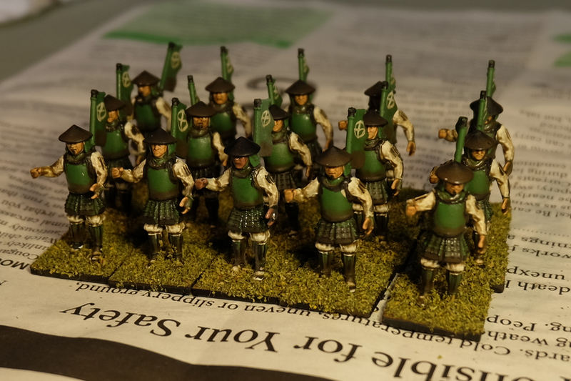 I am considering doing some highlighting over the Ashigaru just to help them pop a little. The dip coat (as mentioned in my last post) does a great job, however I think I do prefer the hats to be painted up after to cover the varnish that inevitably pools on them. I think that I may also do a little extra whitening of the shirts and see if there may be a way to fix the sashimono staining.