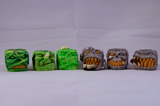 I\’m really pleased that, despite having very different base coats applied, they\’ve all come back to a fairly similar color tone. Much as I love the fluorescent green… the livid green seems enough for them to pop. These guys are nearly done. I want to smooth out the bandages a little more, develop the teeth a little and detail the eyes before I stop.