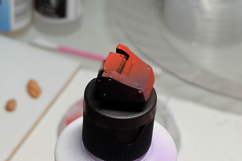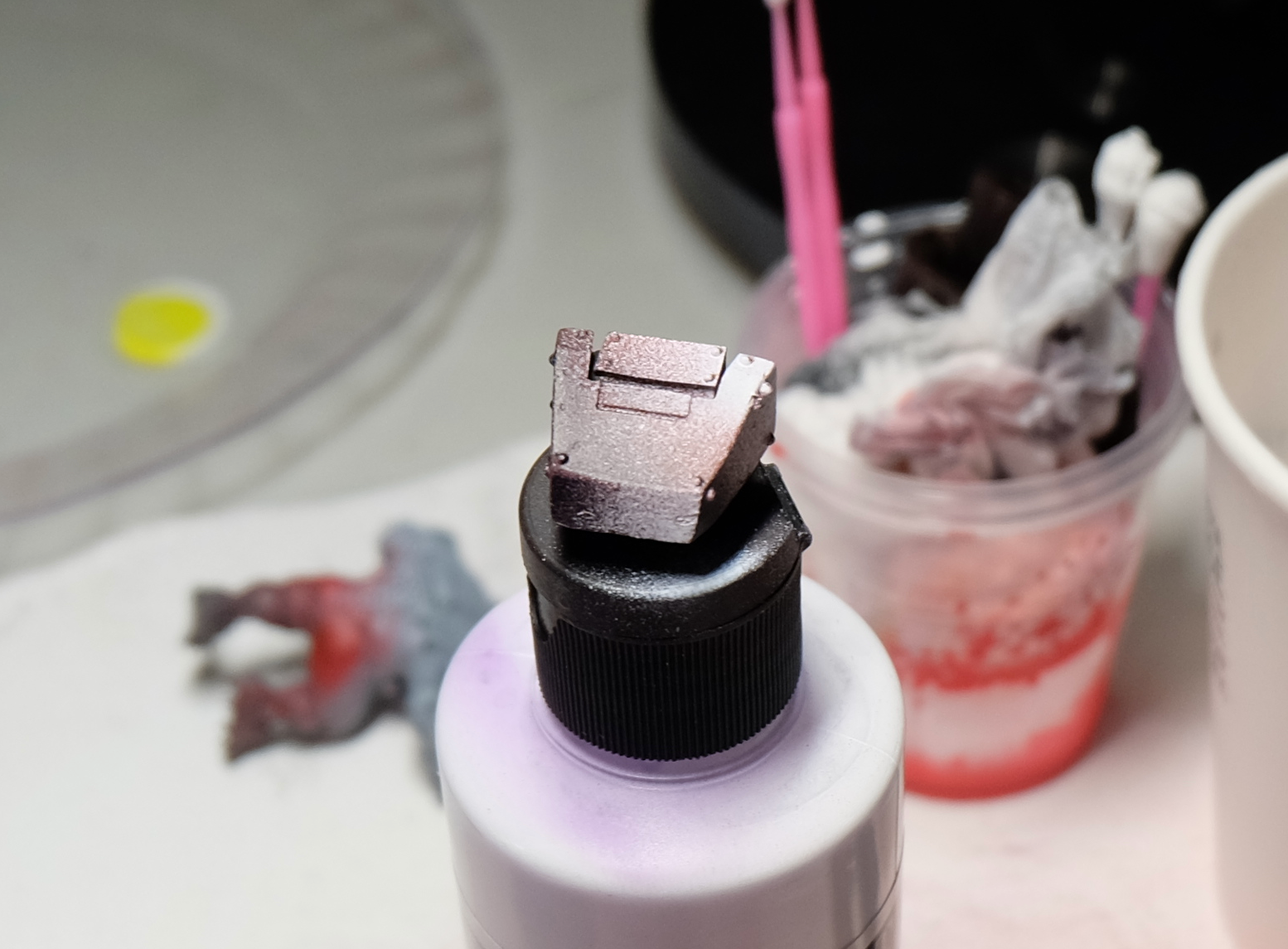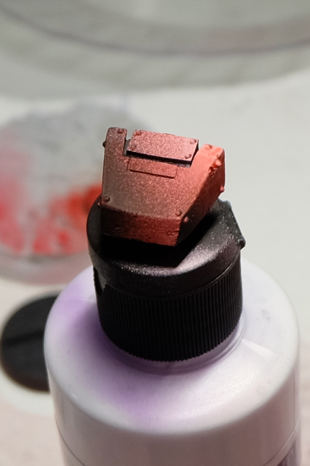 Why? Well to really push the highlight with a super bright glaze. It wasn\’t perfect, you can see that the result was very speckly and a little heavy. This is all part of the learning process but really highlighted the importance of air pressure (higher gives smaller dots) and also using a test card to really see how the paint is going to come out. I also suggest doing this BEFORE spraying on the miniature. 😉