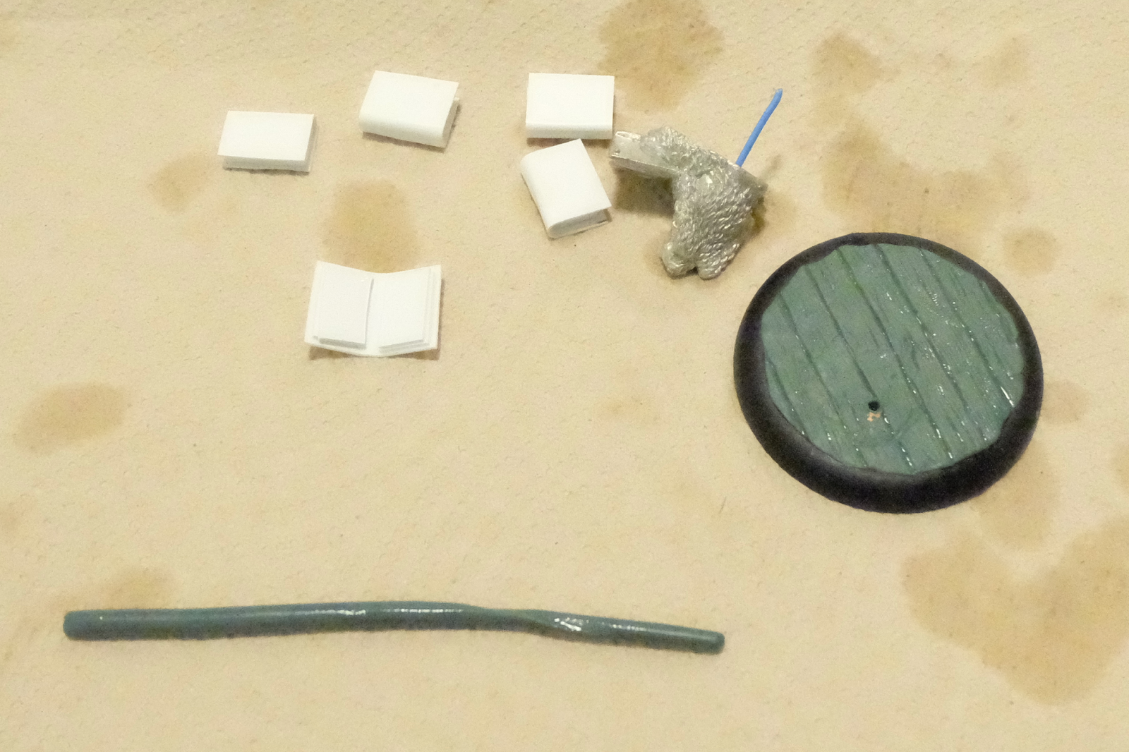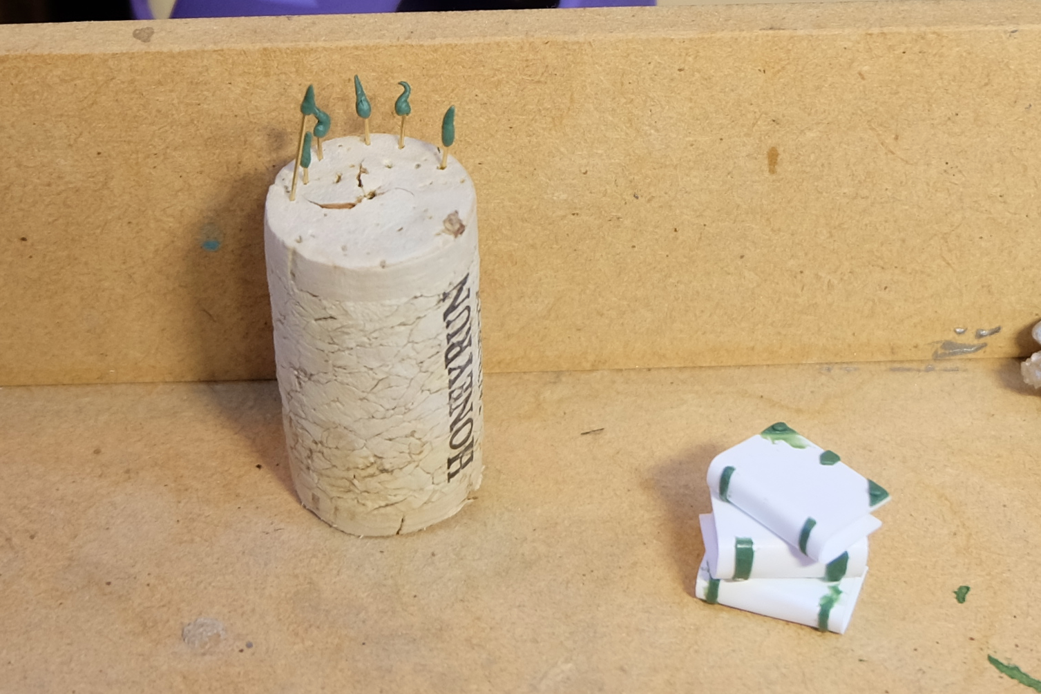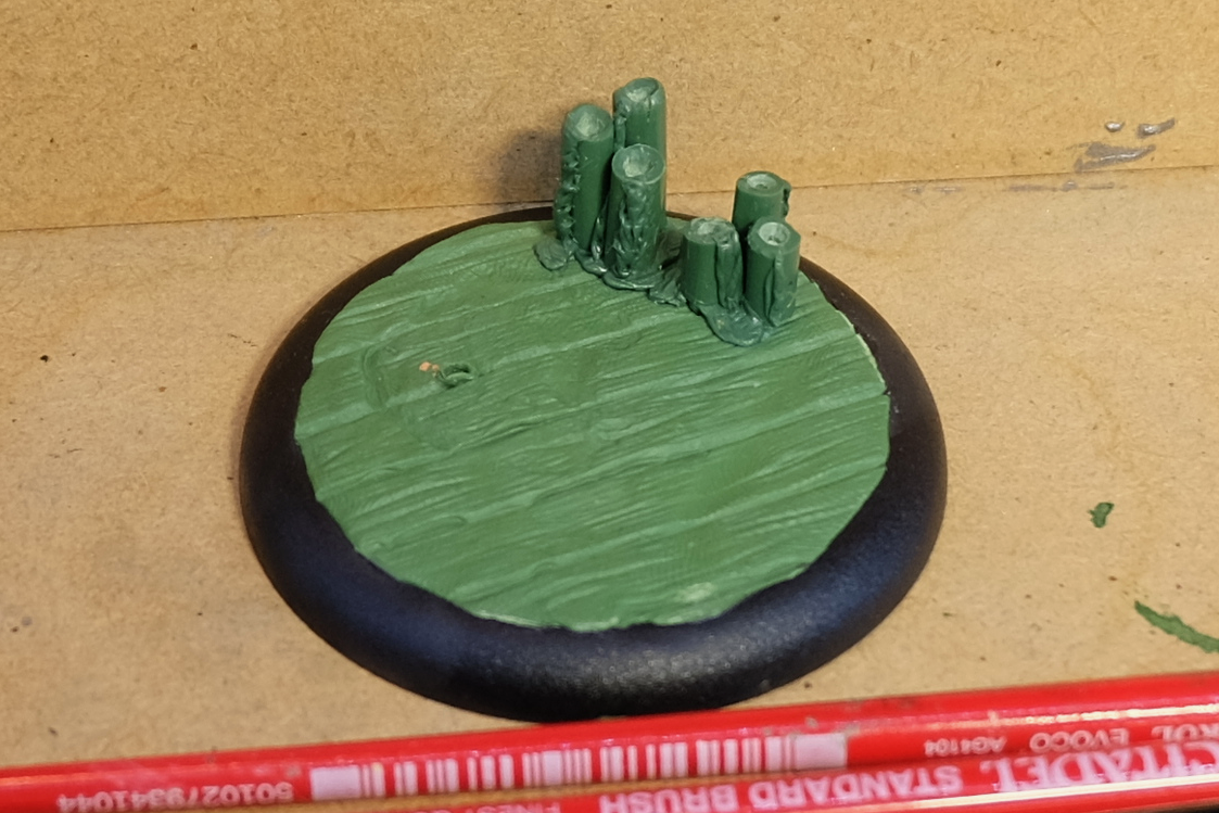 I also made a start on some candles… I mean sure it may look like a long sausage of green stuff to you, but to the truly enlightened (light, candles geddit?) all candles are just cylinders with a dream… or some such bollocks anyway point is with some chopping and drilling and a bit of extra green stuff for dribbles and candle spill: