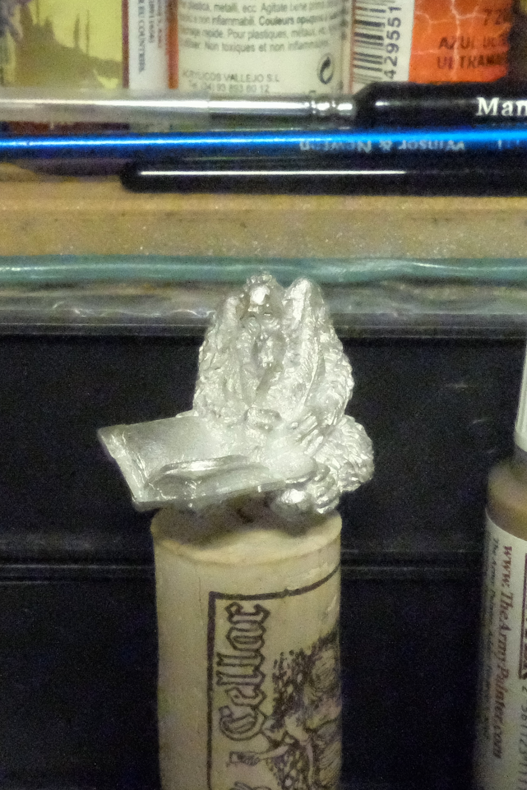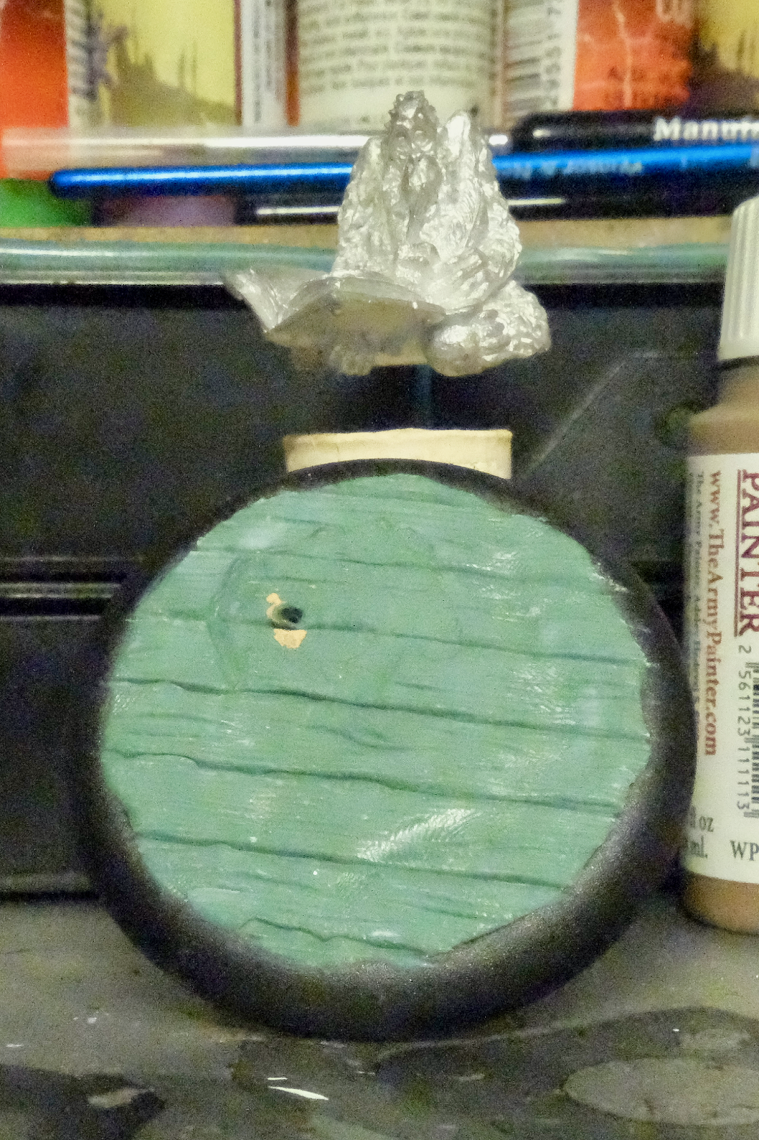 While the green stuff is still not set I gently pressed the Librarian onto the base so I would know where he\’d be positioned. I also used some wet paint to mark the pin hole to pin him to the base which I then drilled out.