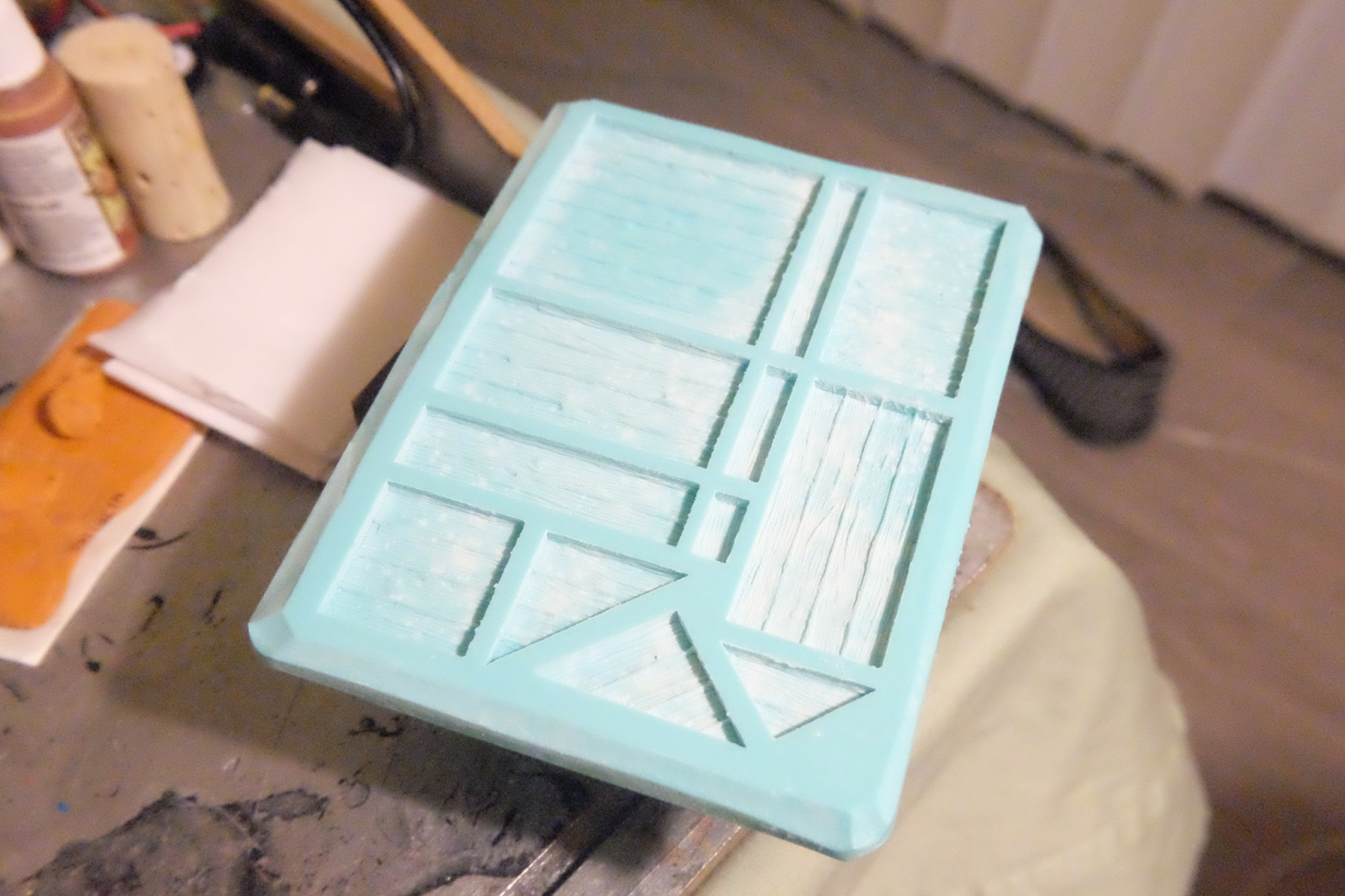 I then pressed it into a Hirst Arts wood panel mold #224. As you can totally not see in my terrible photo, the wood looks rather warped and didn\’t fully imprint. The thing is – I had no idea whether it was even going to work! Those molds are intended for plaster (or possibly resin) casting so the fact that they imprint on green stuff which is pretty firm is awesome.