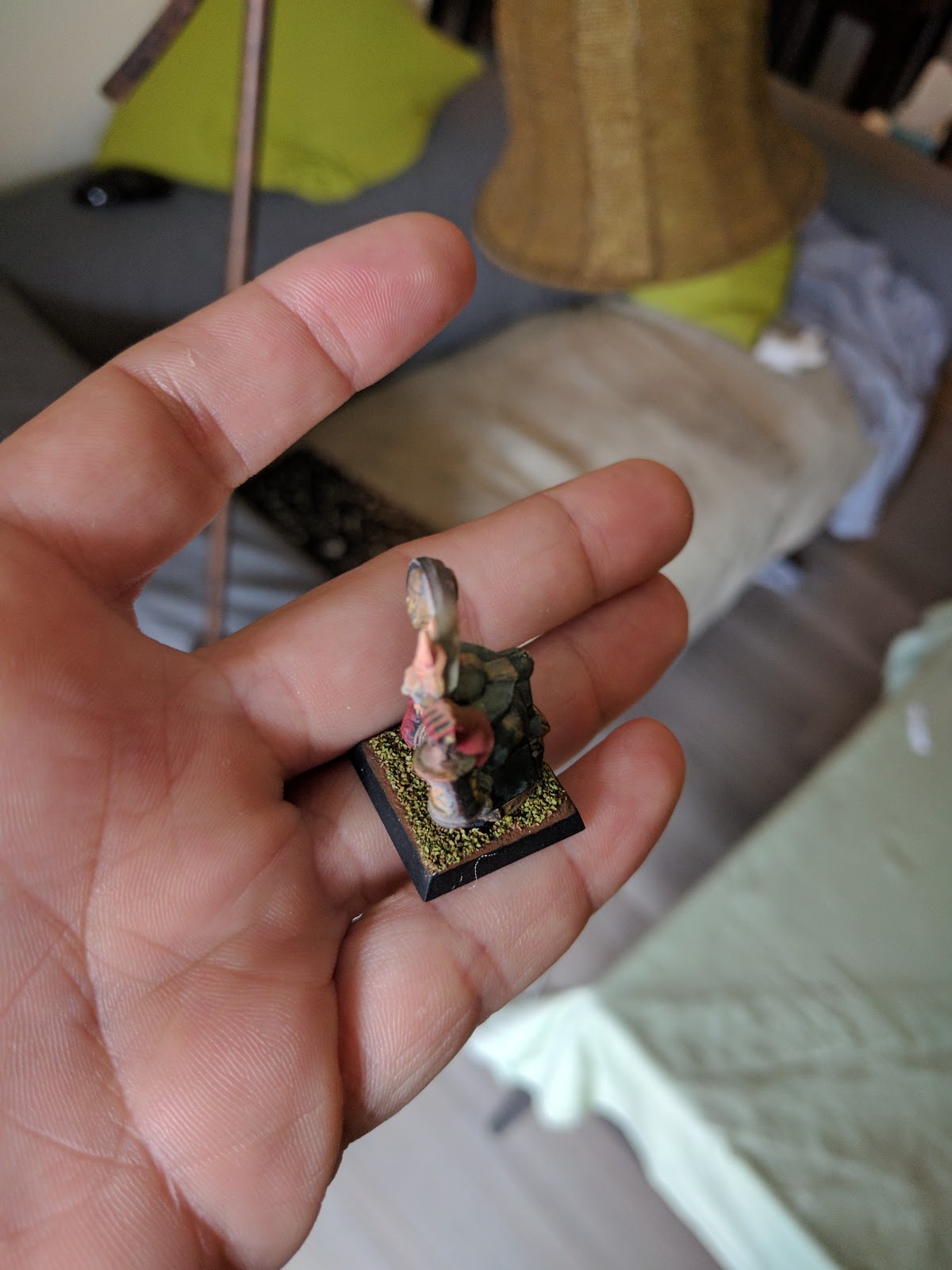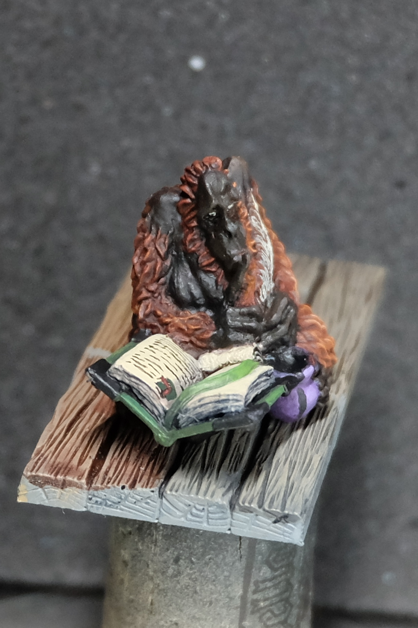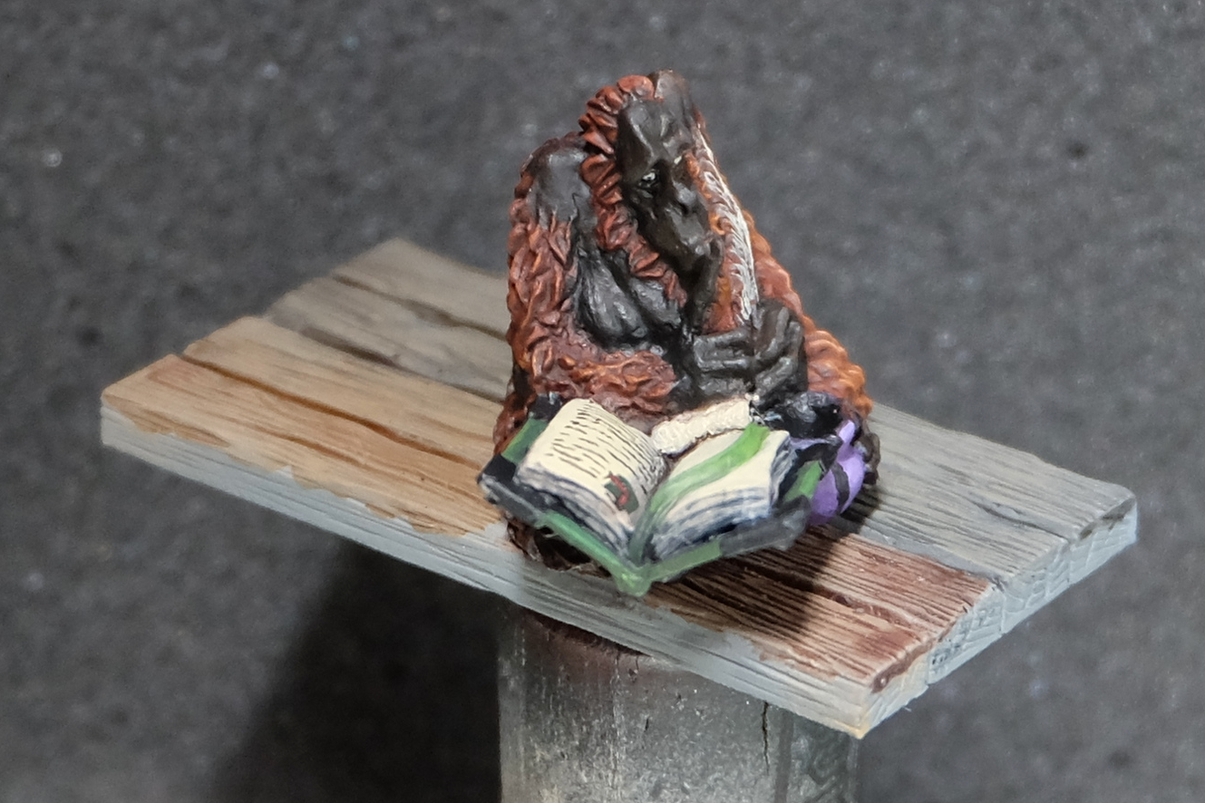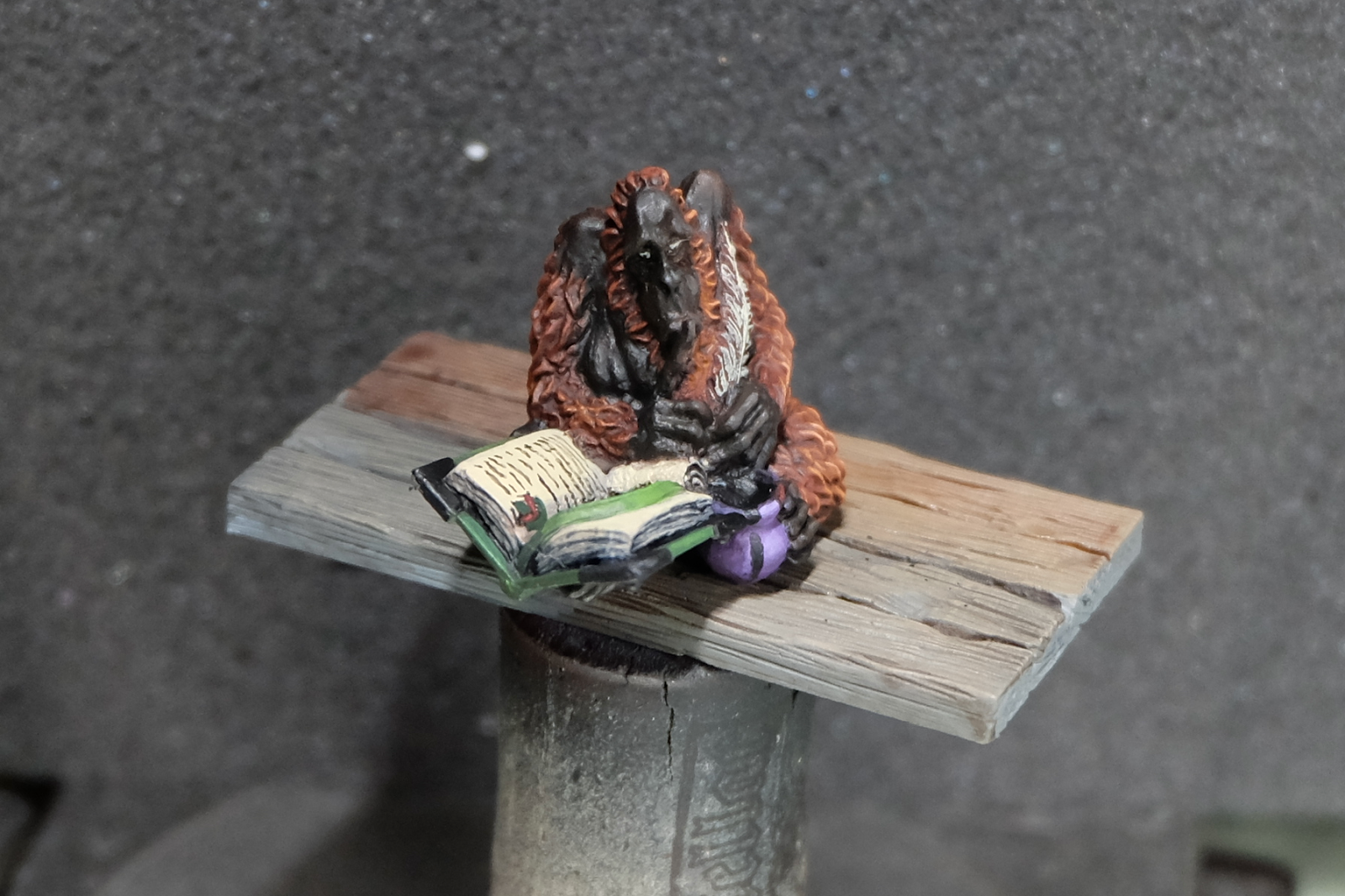 I then drybrushed the Minitaire Mummy to bring it back to a more wood color. I drilled through the middle of the board and added it under the Librarian to allow for direct juxtaposition.