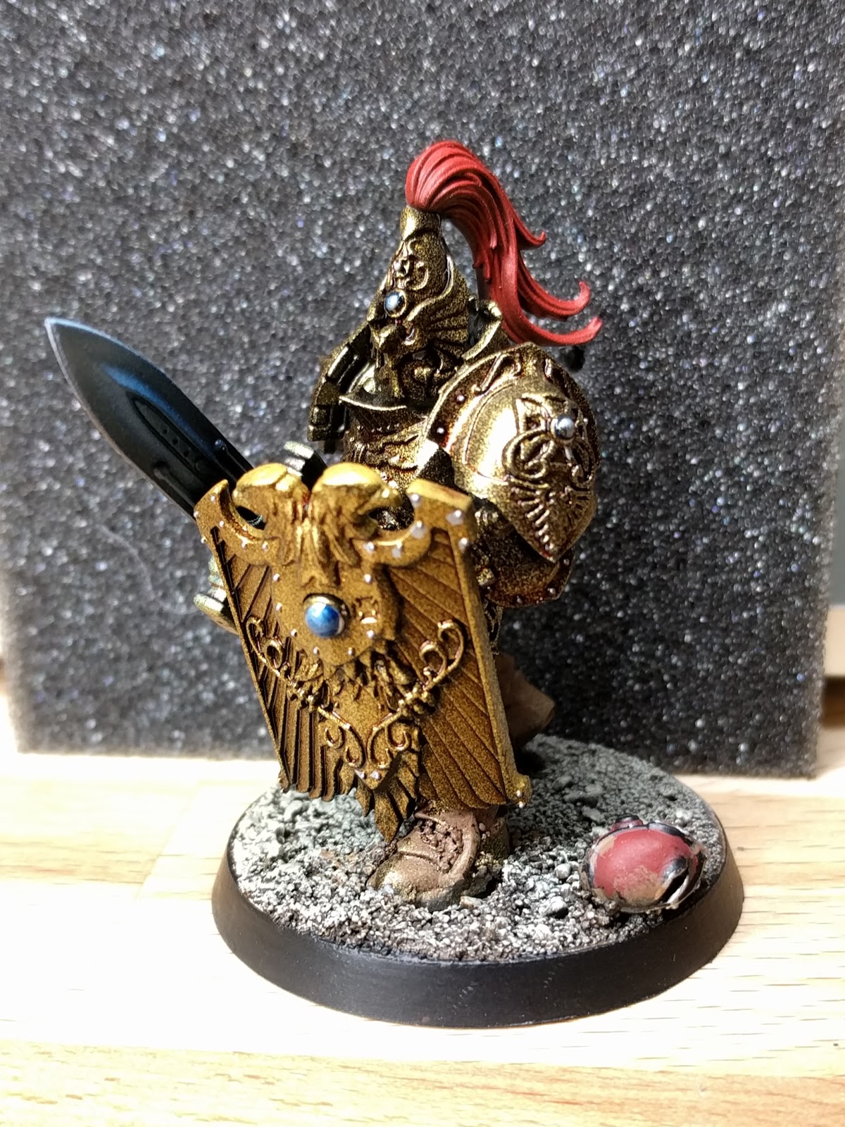 The gems here were painted very basically using Army Painter Plate Mail overlaid with GW Technical Soulstone Blue. This is a technique endorsed by GW itself but I found getting coverage to be a trial. The finished effect is still less powerfully blue than I hoped but compliments the red nicely.
