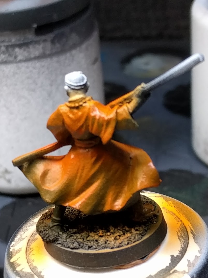 Starting point is a nice zenithal prime (using Stynylrez Black and White) before building an orange glaze: