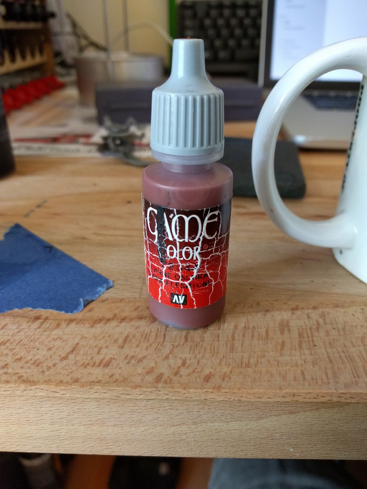 It\’s important to remember that glazes like this filter light. When applied over other colors there can be some unexpected results – in this case there is a lot of green in the Stynylrez Black and this came through strongly. The result is kinda green in the shadows…. soooo let\’s modify that zenithal with a shade of Vallejo\’s Dark Flesh instead. I also had to reestablish the highlights to prevent the model darkening: