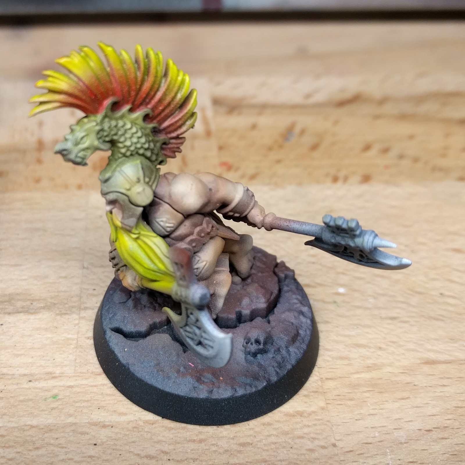 ScaleColor Inktensity Red airbrushed on added some vibrancy to the plumes. I also started blocking out the hair at this stage with Vallejo Model Air Sand for Blond, Vallejo Game Color Dark Flesh for red and Vallejo Model Air Olive Green for brown: