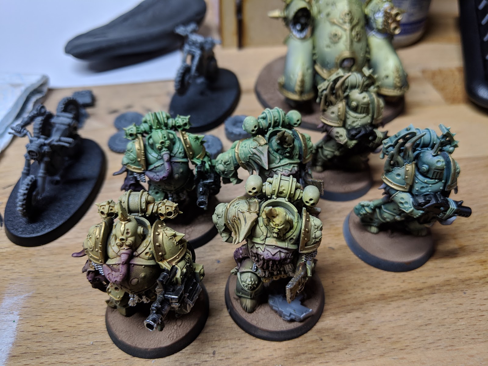 It\’s a new year, time for new beginnings and for me, that meant – deciding on a new armour colour scheme! Determining a new painting scheme is an interesting process. I really struggle to visualise how colours will look on a model (I\’ve mentioned this before particularly – here). For the Death Guard army I\’ve been building up as part of the Conquest Magazine subscription. The thing is – I never really understood why Death Guard changed uniform colour during their time lost in the warp. I can imagine the palette shifting, tainting somewhat but having a total uniform change in the warp just seems weird. So I\’d decided to go for a more traditional, pre-heresy aesthetic.