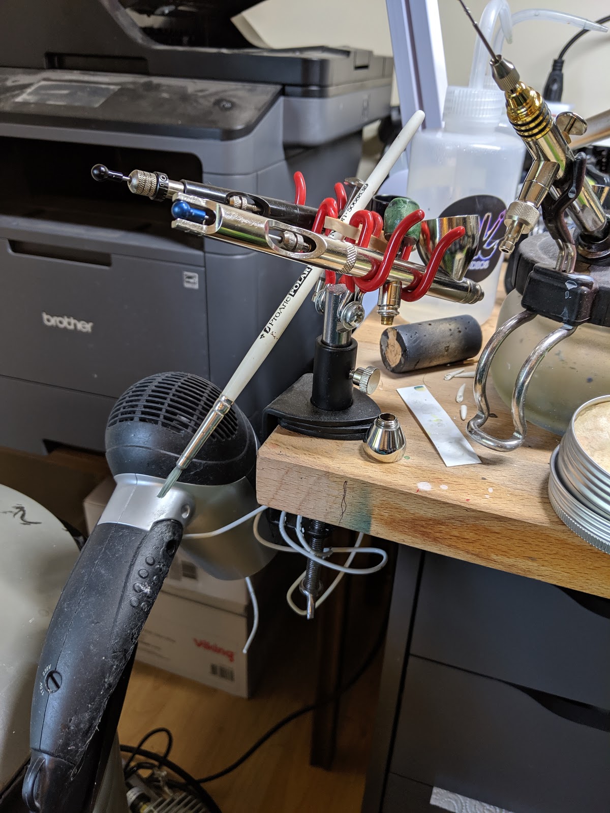 – I switched to this for a couple of reasons – It bolts to the table which (like with the light) means it uses less desk space. More importantly it also means the airbrush is very secure in it. Do give my hair dryer a holster, I bent a wire coathanger into a loop sticking out of the underside of the mount: