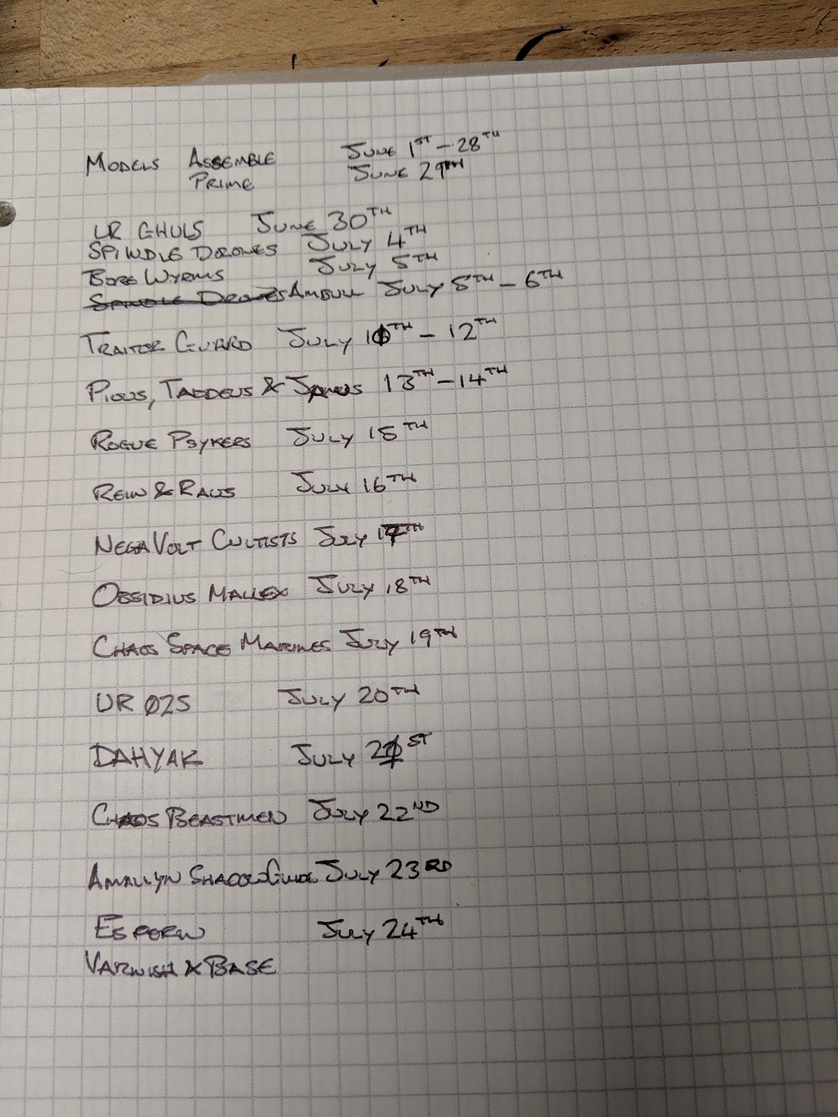 Ur Ghuls (25mm): June 30th (done)Spindle Drones (25mm): July 4th (done early)Bore Wyrms (25mm): July 5th (done late)Ambull (50mm): July 5th-6th (done late)Traitor Guard (25mm): July 11th-12th (done)- Pious, Taddeus, Janus (32mm): July 12th-14th