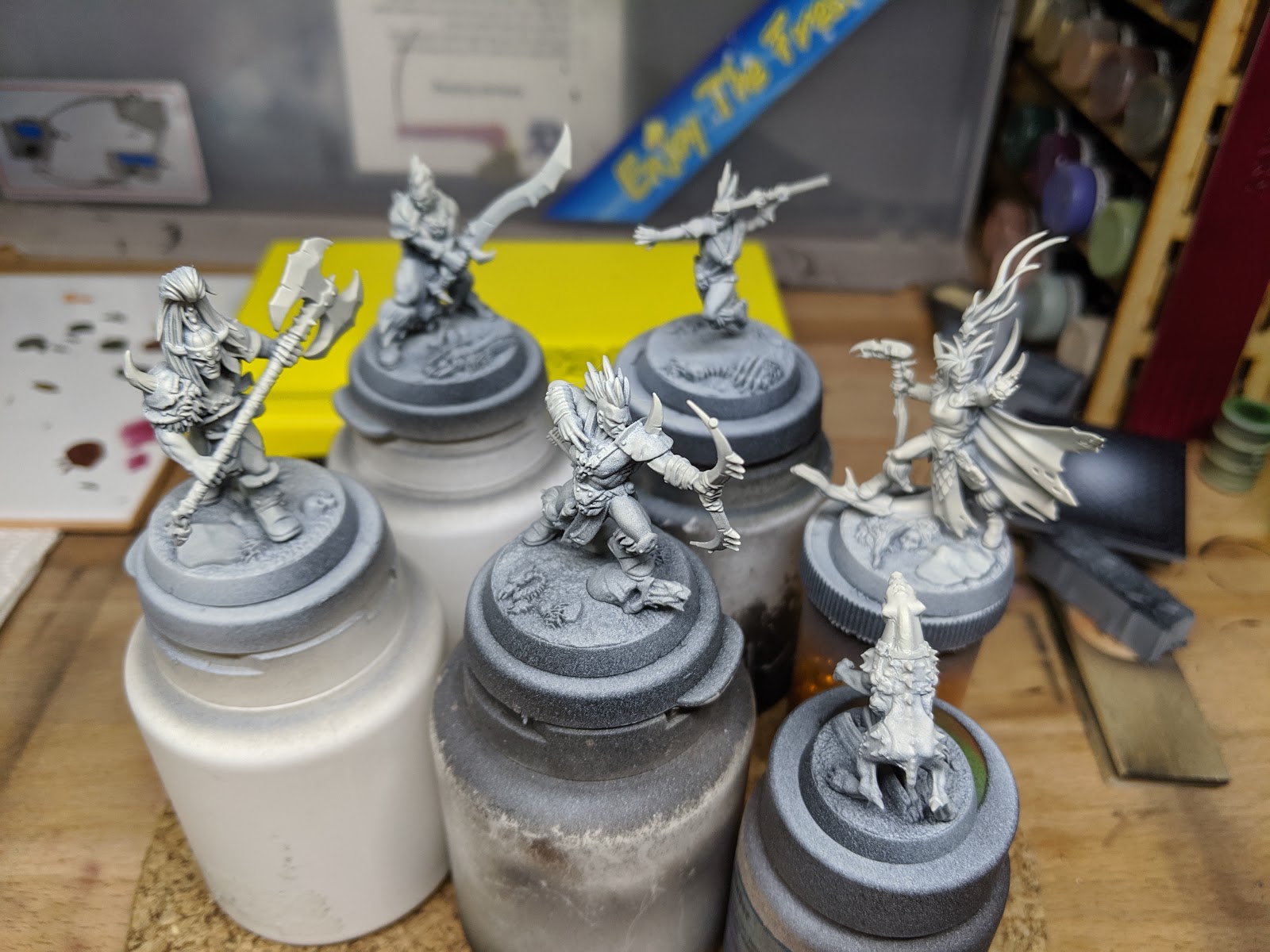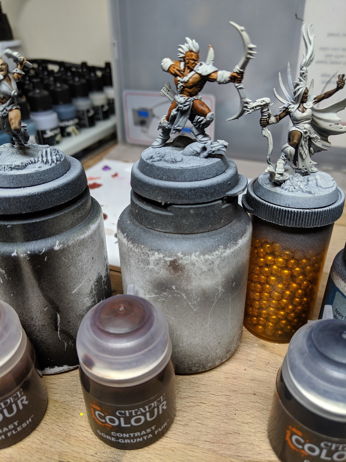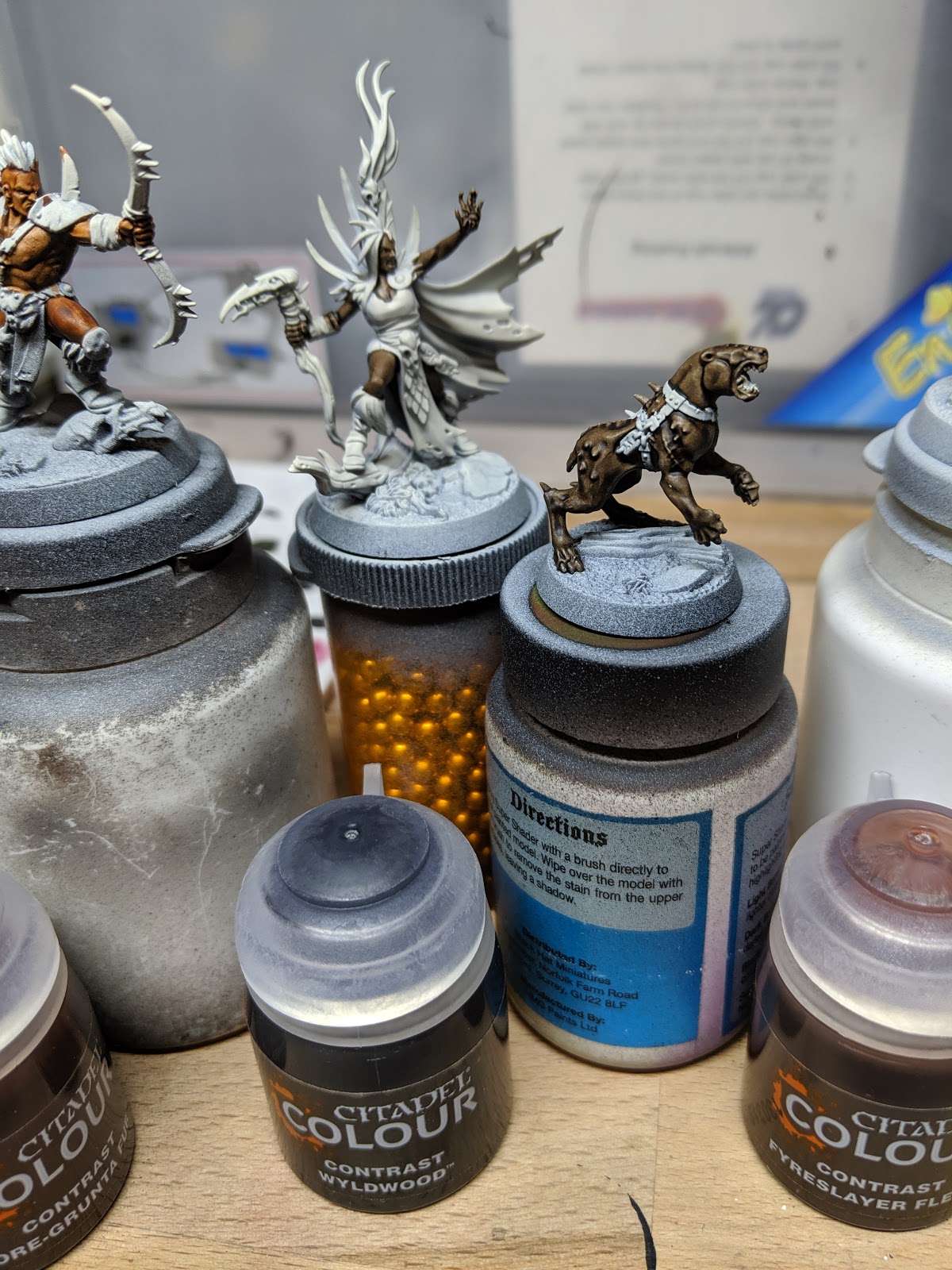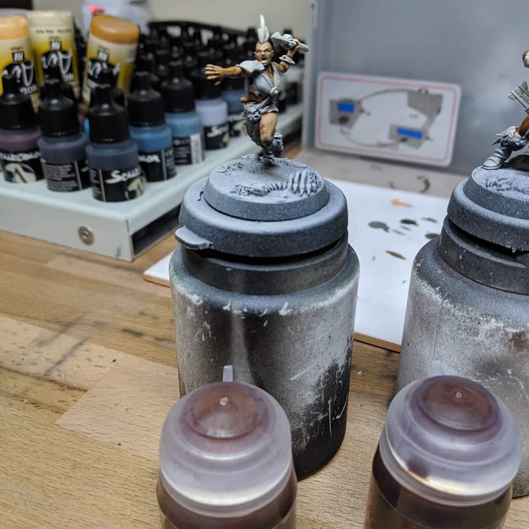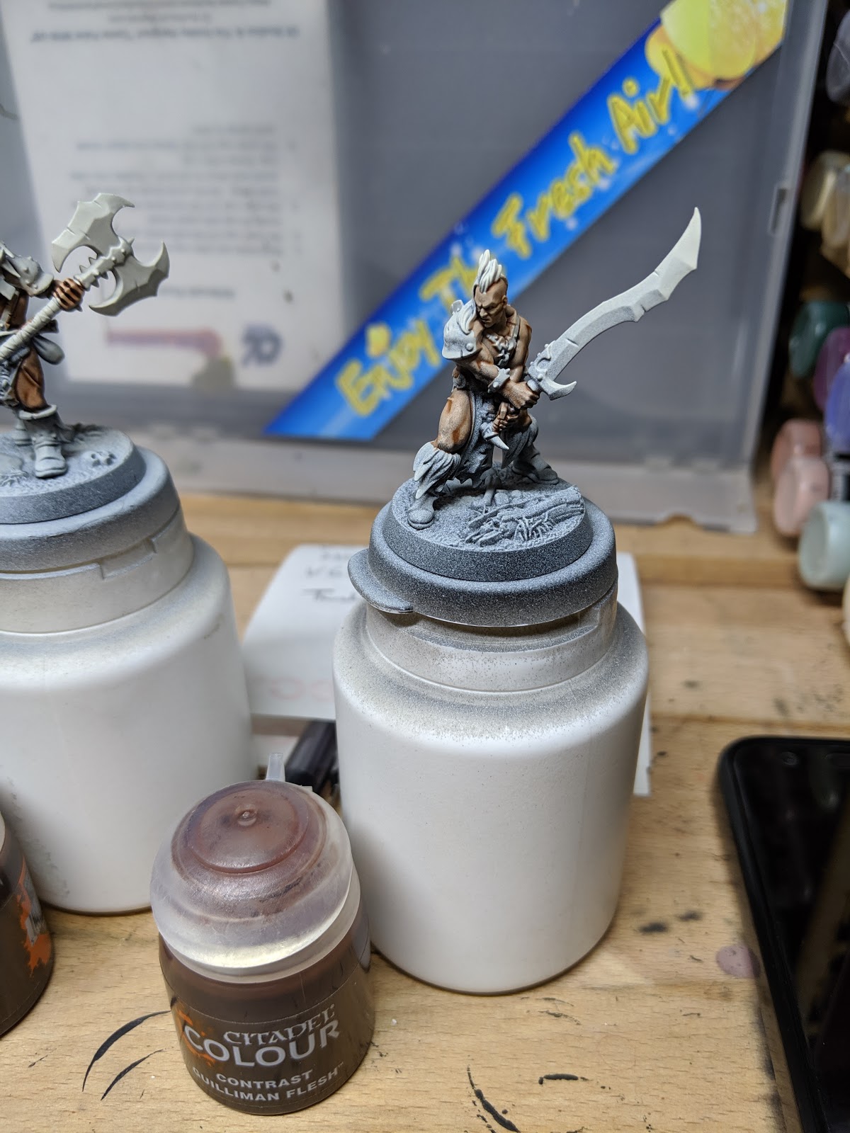I started with my now standard approach to preparing for using Contrast paints. I primed the models black (Stynylrez Black Primer) and then used the GW rattle cans to lay down a zenithal of the state approved primer for Contrast Paints (Wraithbone in this case for a warmer tone).