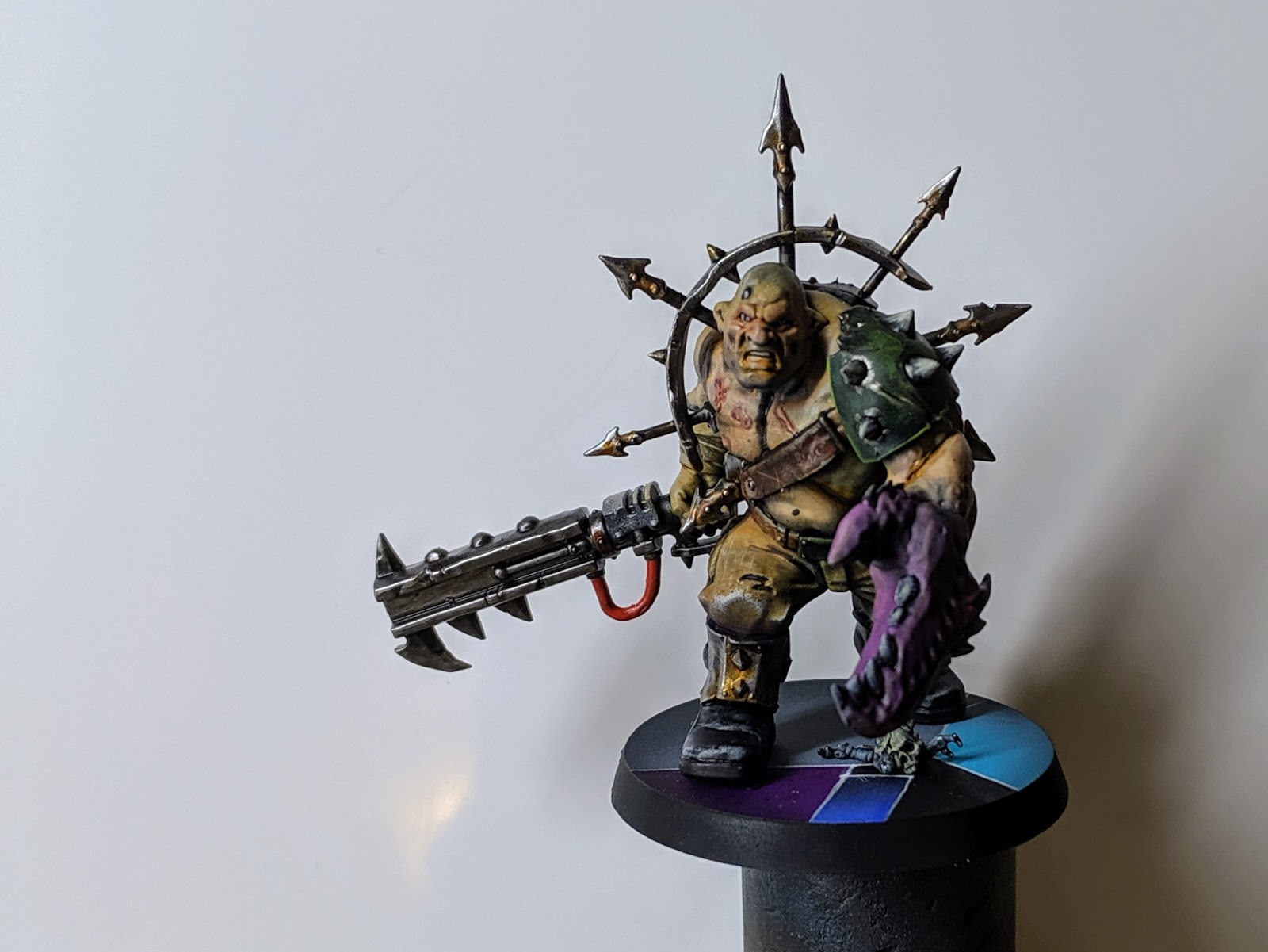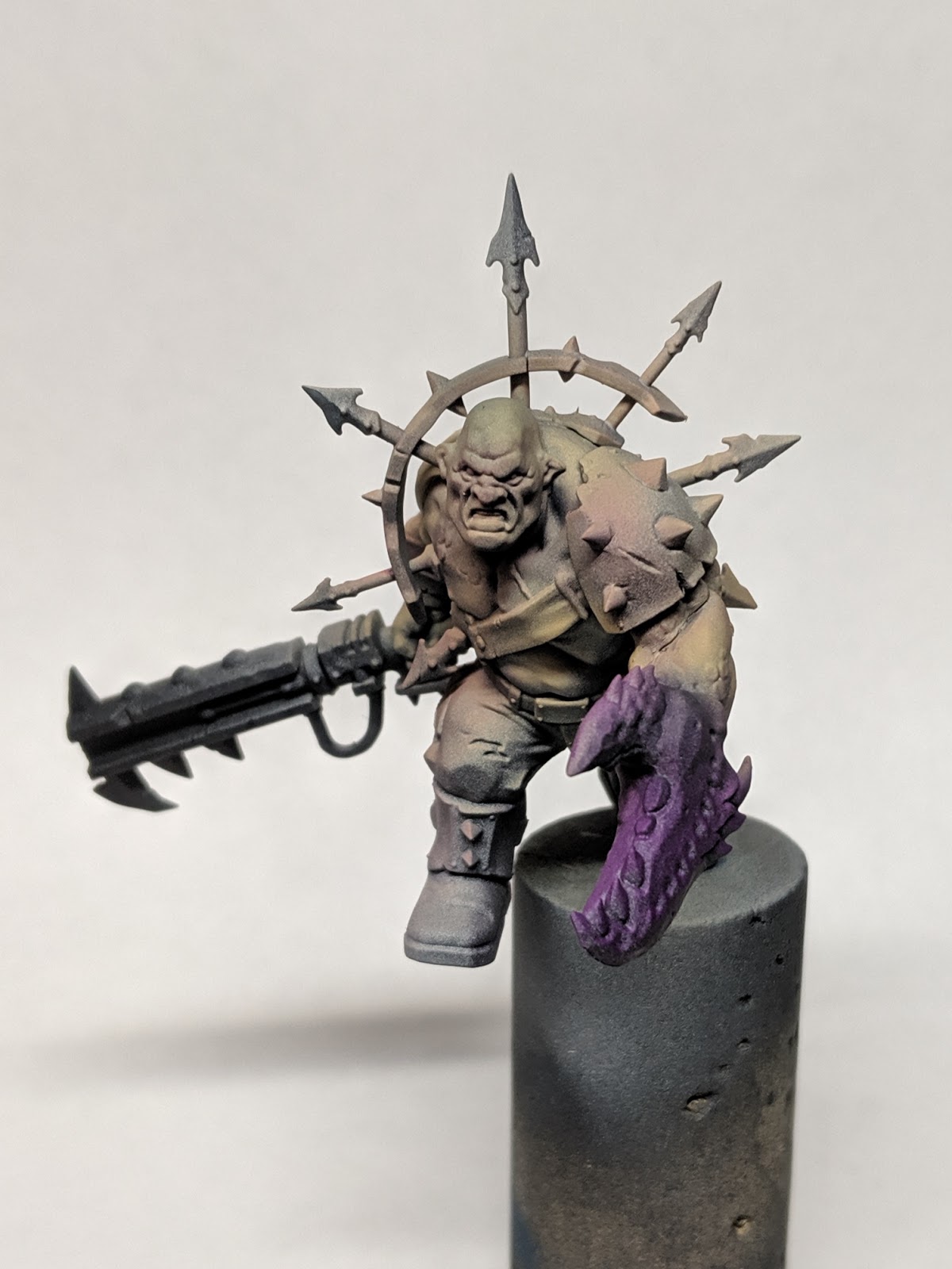 The initial airbrushing was a lot of fun, introducing a lot different hues into the skin tone, the unhealthiness an implications of the taint of chaos. As with the other Chaos denizens of the Fortress I wanted to link them together and this chap is an Ogryn – the Astra Militarum have Ogryns – boom he\’s clearly a buddy of the Guardsmen. By the time I\’d started texturing up the trousers, I suddenly realized that Everchosen was around the corner so I figured it was something to shoot for. Of course it is not what I was really meant to be working on but hey, that didn\’t stop me!