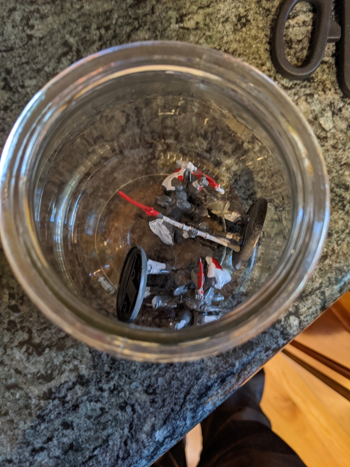 24hrs later and it\’s clear that the paint is coming off with ease. pulling the models out and giving them a light scrub with a toothbrush get\’s everything but the primer off. Already most of the primer was flaking off but I figured I\’d give them another 24hrs in the drink to try and get the rest of the primer off but even if not much more comes off, I should be good to reprime and paint!