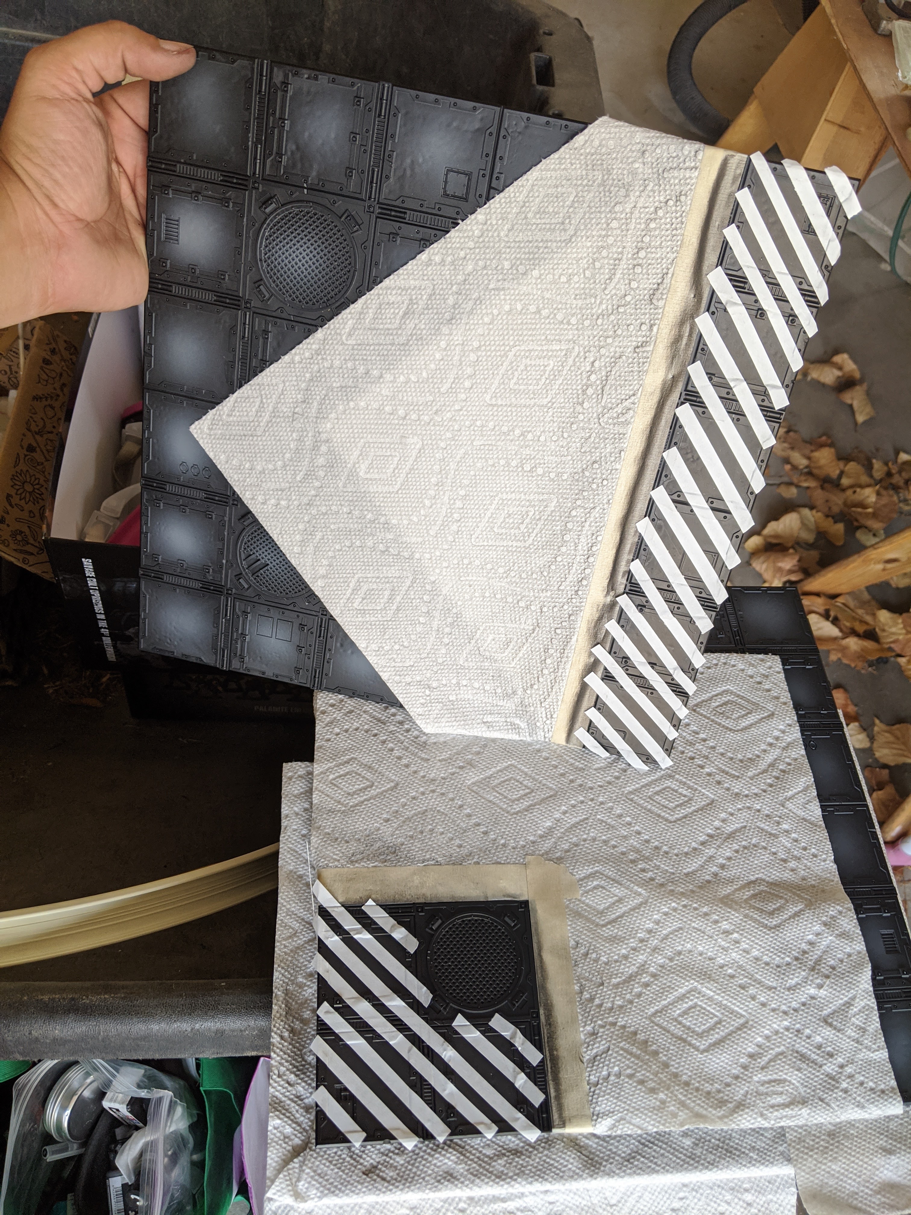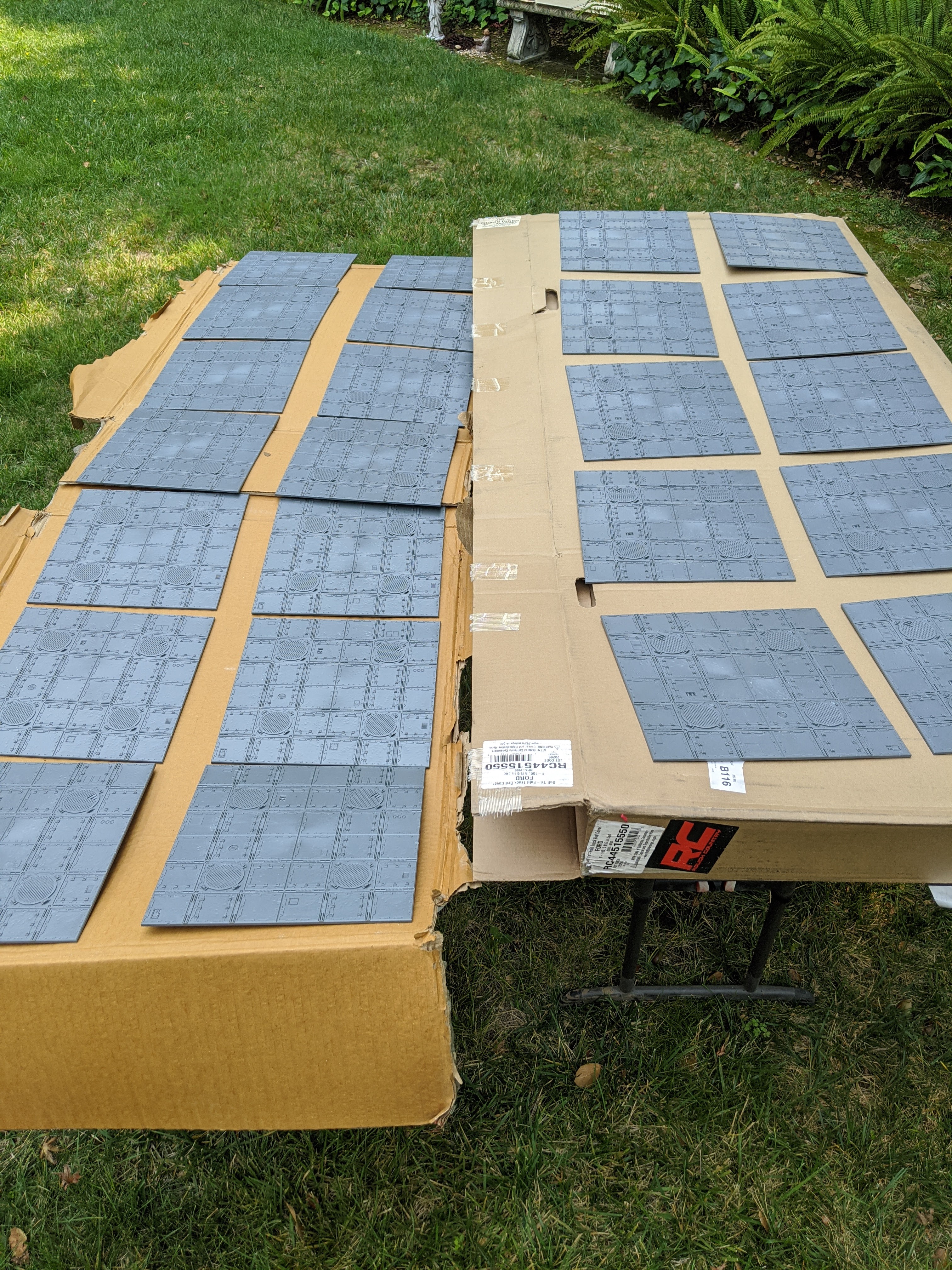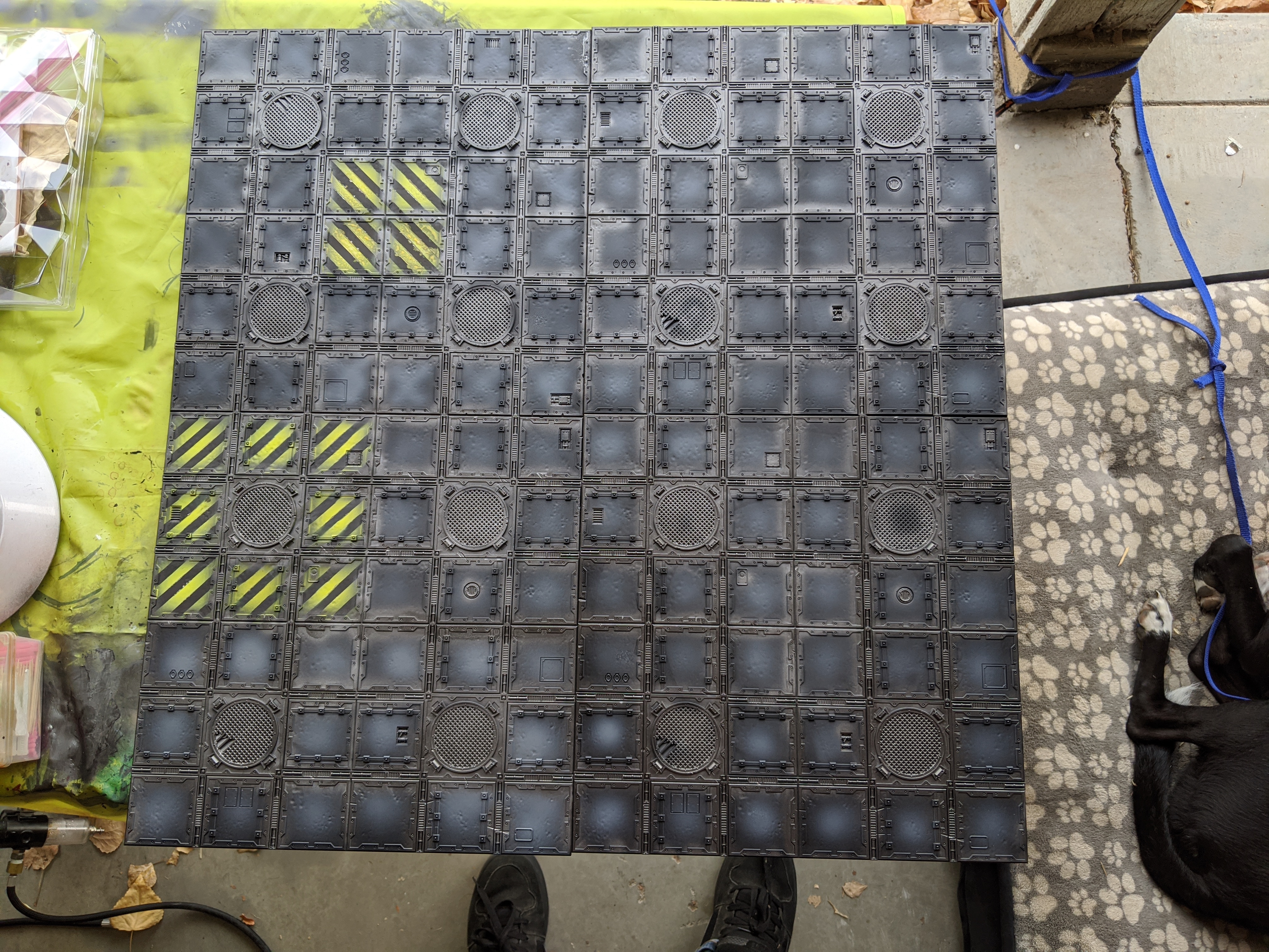 As you can see a 6\’x4\’ table is made up of a LOT of tiles, although this makes for a daunting task, it also gives a ton of options and variety for the finished thing. Terrain tends to get hacked about a fair amount and for that reason I much prefer to prime them with more aggressive rattlecan primers that will give a better bond with the plastic. From there I actually worked on the tile highlights rather than the metal edging as done in the GW tutorial. I used Stynlrez Grey primer for this as I have a decent sized pot which wasn\’t getting used for anything else.