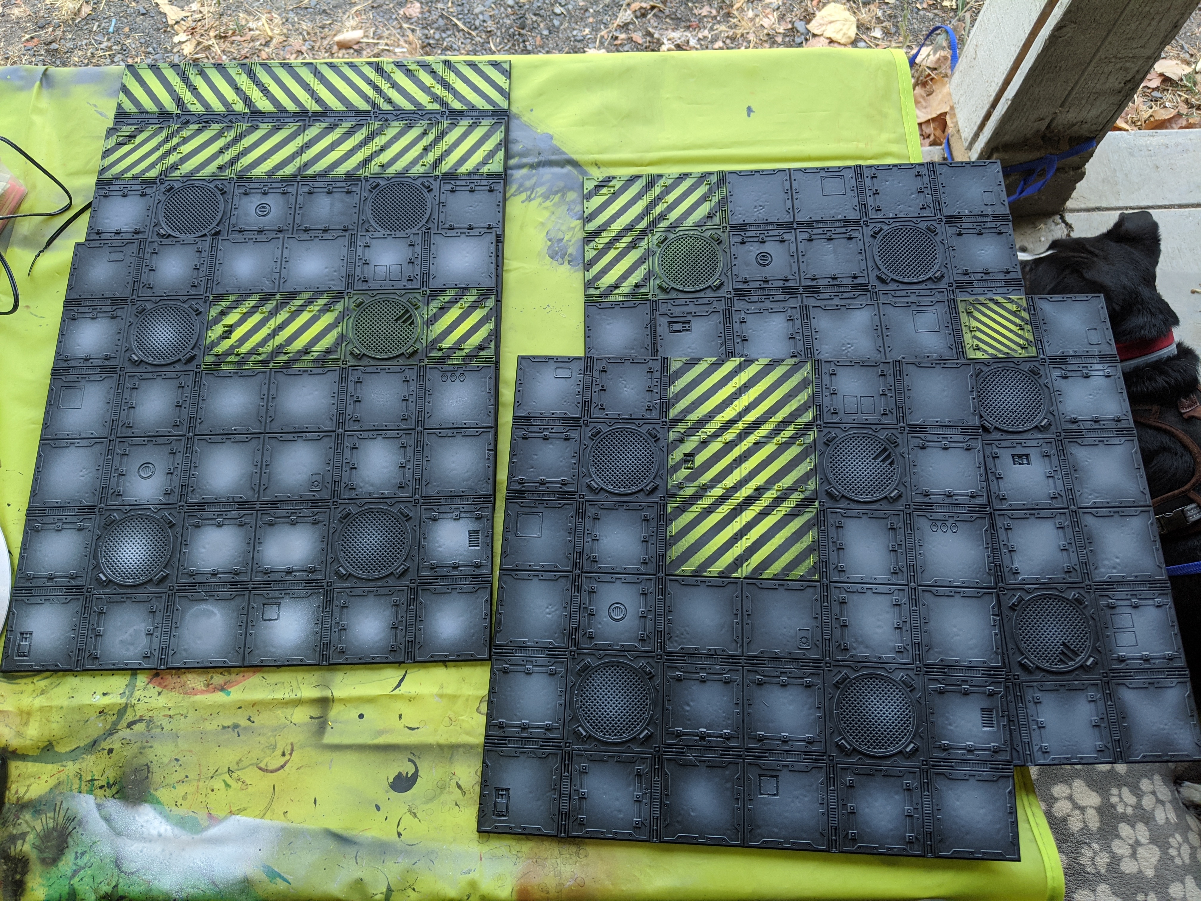 One of my issues with the GW tutorial is that the hazard stripes are glossed over, yet this is possibly the most striking element of the finished tiles – as well as something I know from past experience to be a real challenge. I wanted the metal to show over the hazard markings so I pushed this stage back to later in the process. There are positives and negatives to this but generally I think it was the right thing to do as it helped unify the overall look of the tiles. Stencils are tricky, slow and cumbersome to apply. They are prone to seeping paint which can ruin the effect but you won\’t know until after the whole process is finished.