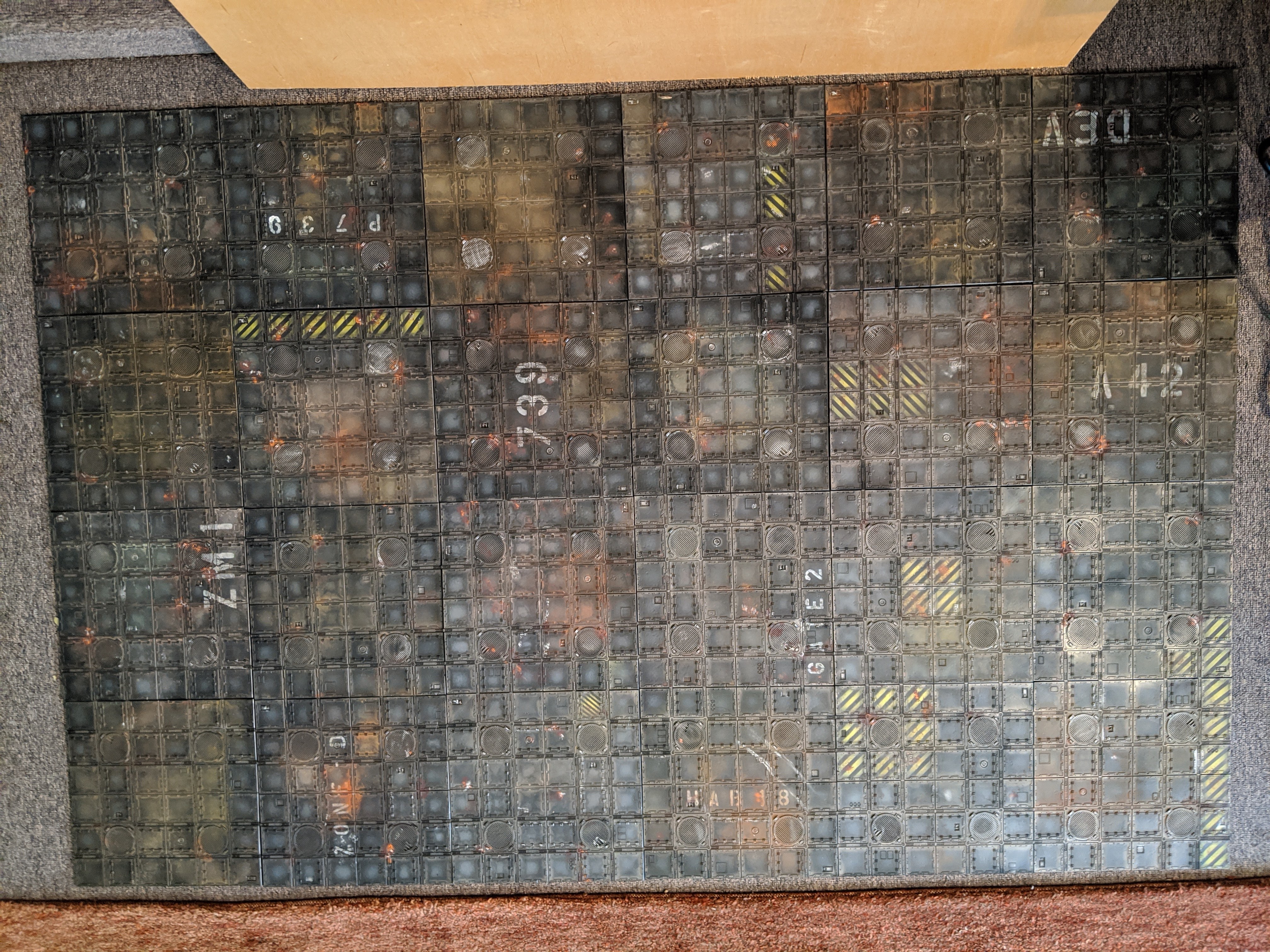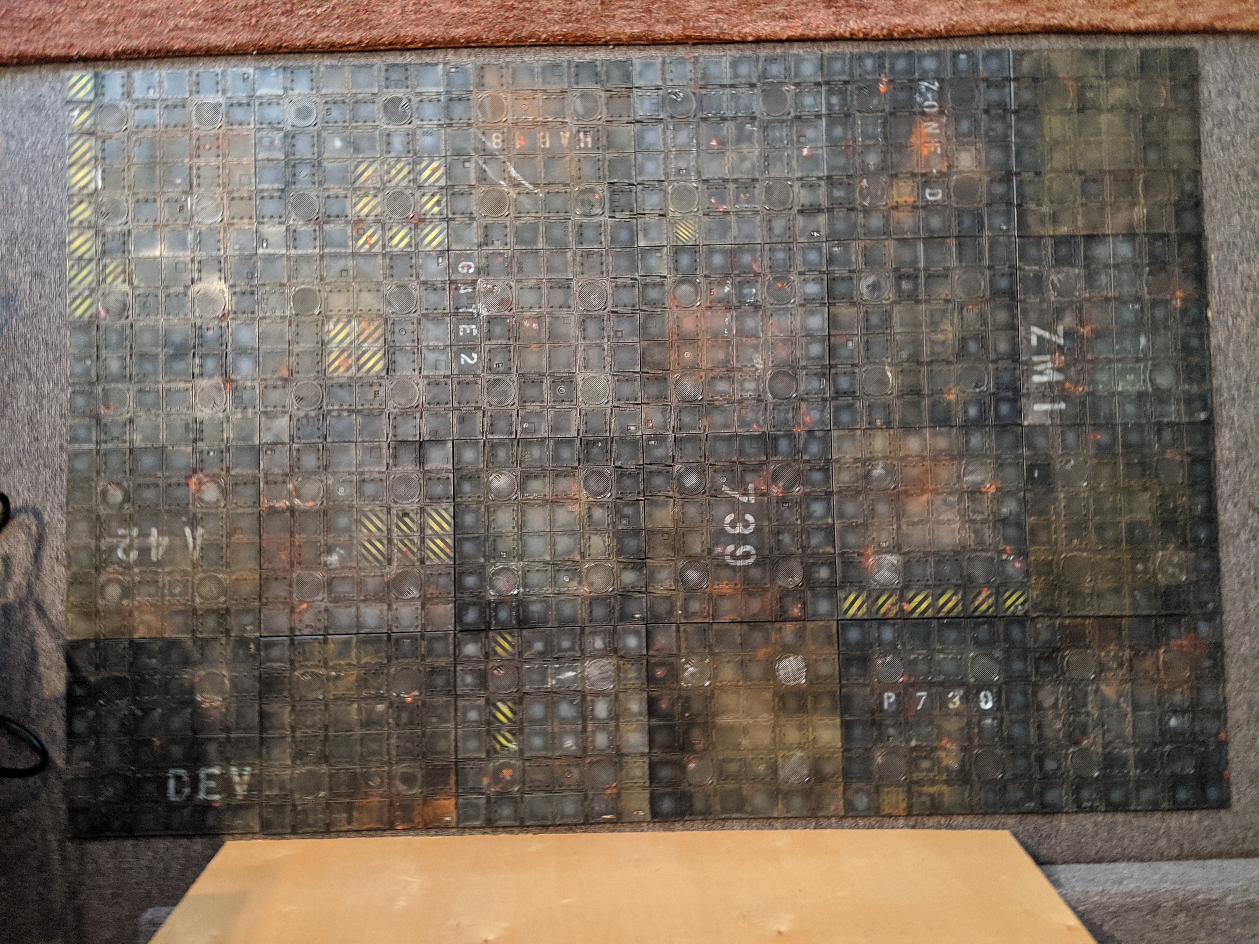 Getting the letters done proved surprisingly difficult… because I really struggled to find stencils of the right size. Eventually one of my local hardware stores did have stencils that I wanted and I was able to get them done. I intentionally went with large letters here. These aren\’t health and safety warnings for the denizens of the underhive but rather area designations to assist the authorities hunt down their targets. I used 1\” and 2\” letters that I pre-assembled with masking tape to hold them together and then taped to the board. The white is Windsor & Netwon Artist Acrylic – Titanium White sponged over the stencil. Sadly because the stencils are cardboard – taping them together rendered them difficult to reuse in any other combination however I think it was worth it for the effect they produced.