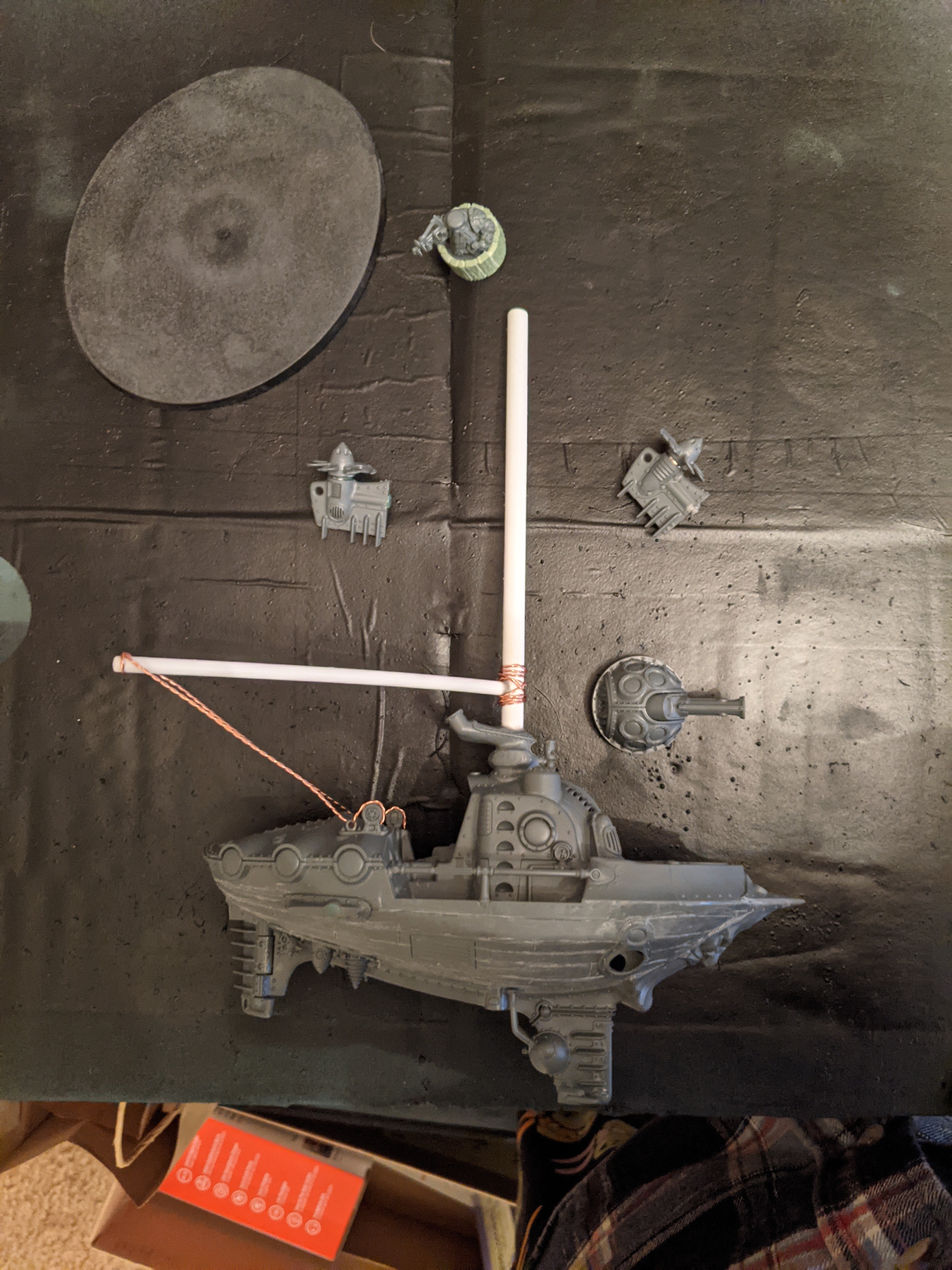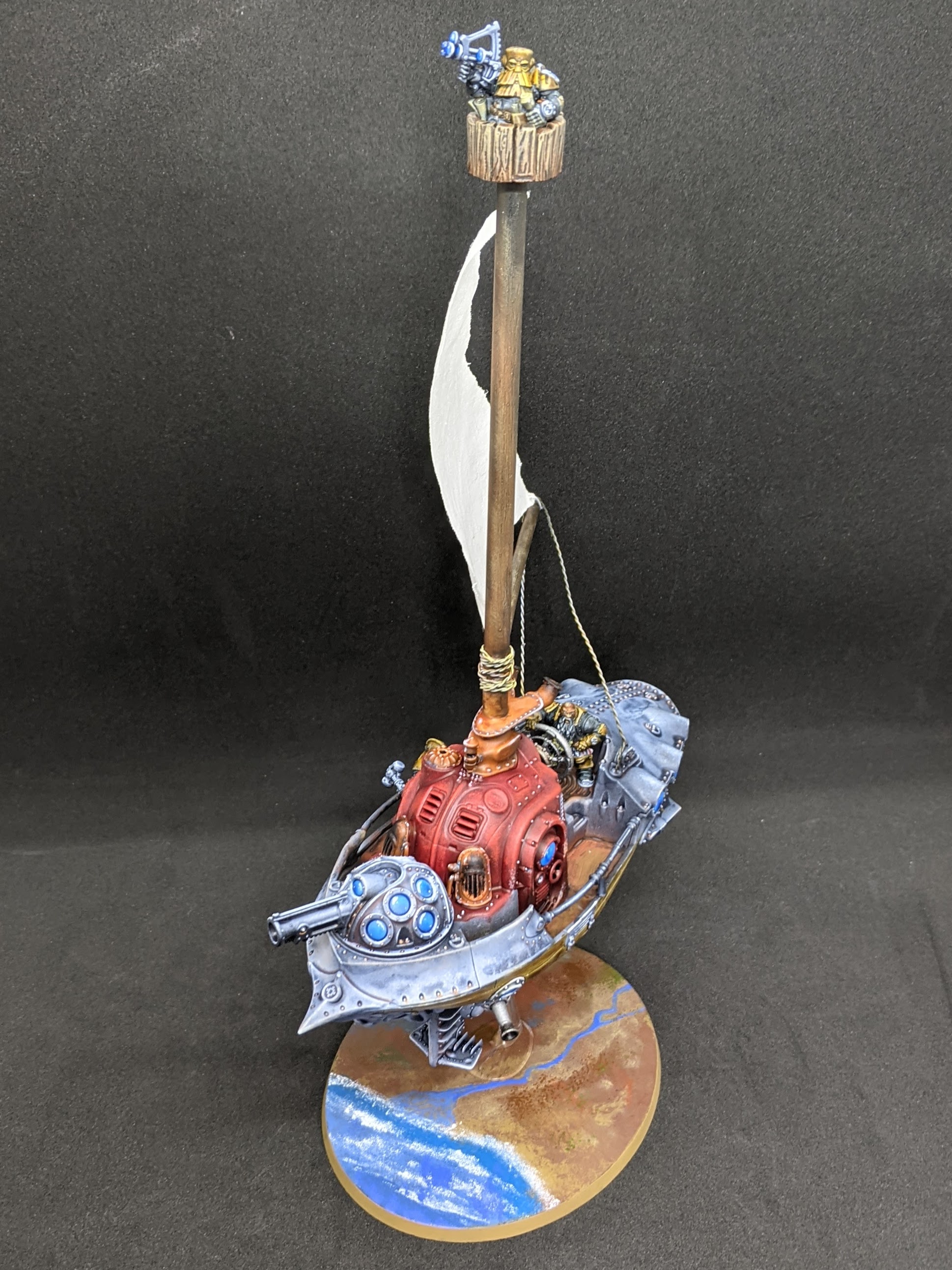 For the base – I wanted to give the impression of the ship really soaring at altitude over Ghur, so I painted up an abstracted piece of terrain, using coast and river to hopefully give a sense of scale. This was definitely rushed and I think I will have to go back and rework it in the future, along with a few other elements I am not super happy with (the wood grain effect, the flooring and a name for this beauty).