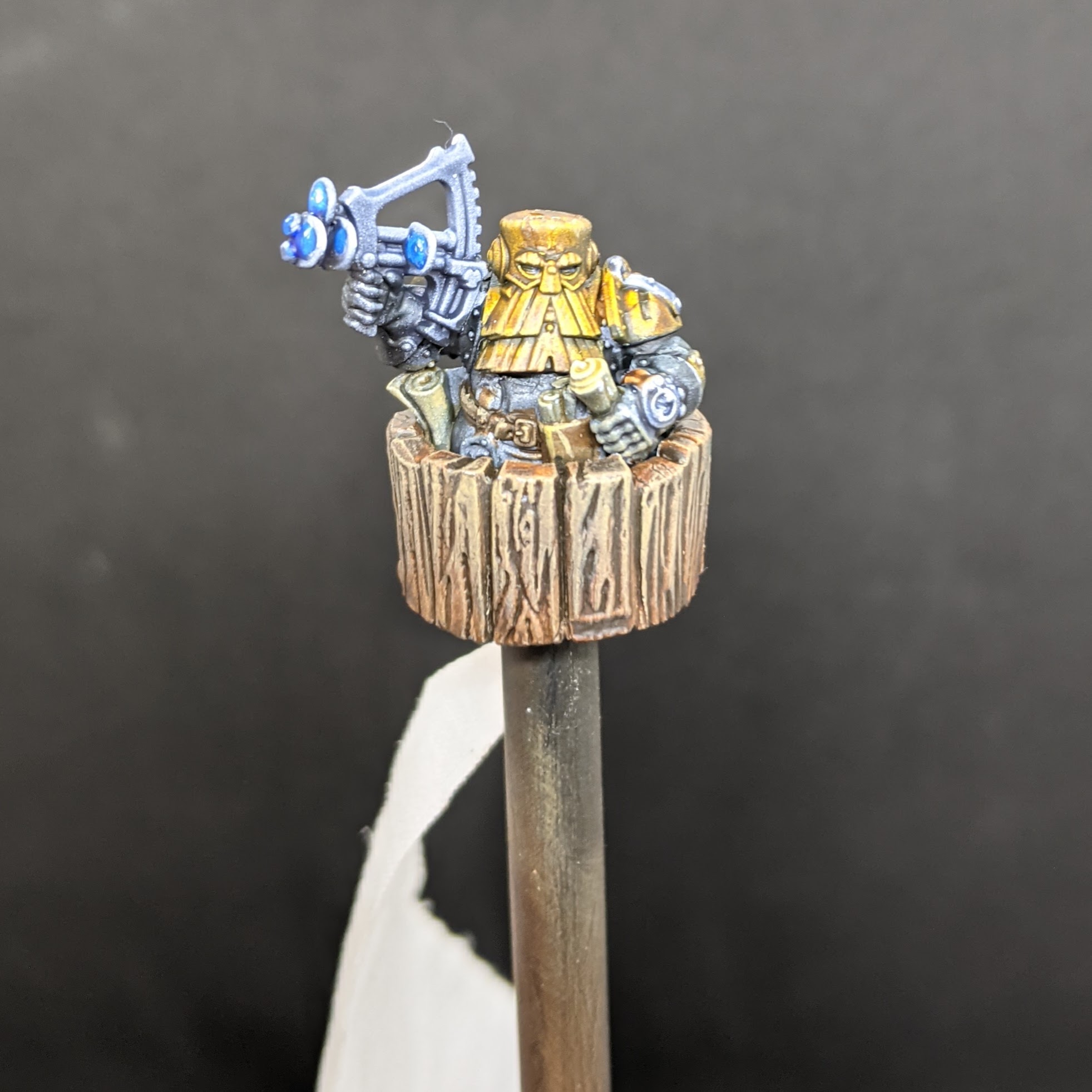 The mast was given some slight wood texture with the application of a course sandpaper to help it feel a little more like weathered wood than a steel pole or something. It also provides something for a drybrush to pick out.