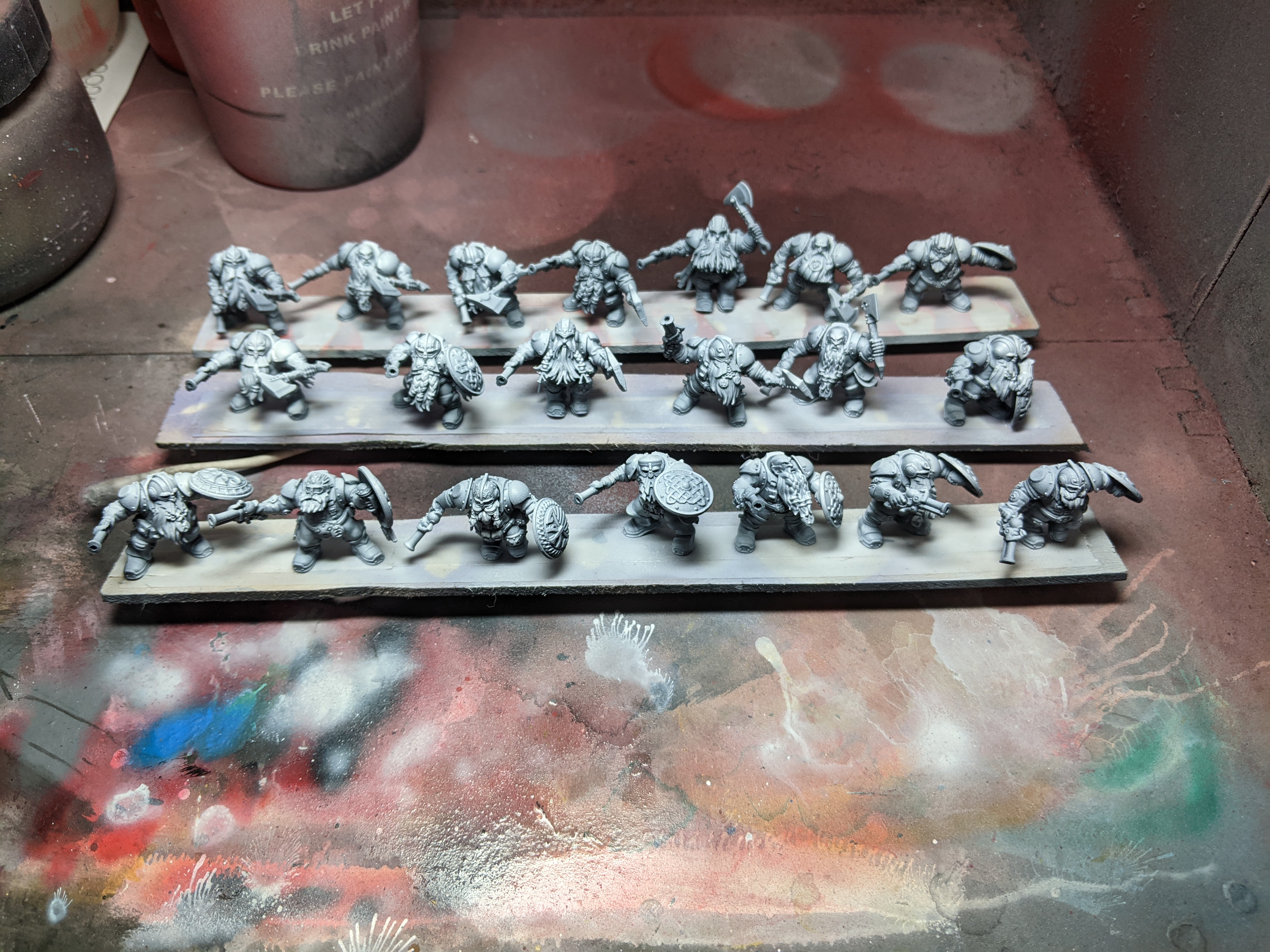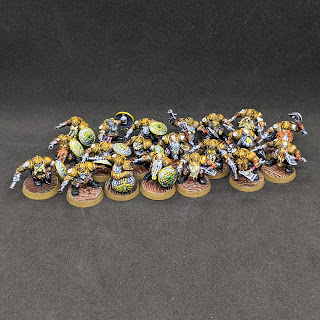 Painting 20 went faster than I\’d expected, even having to do extra bases and more customization, it was clear that my colour scheme had become second nature at this point. I even put a little more care into the highlights and detailing that I\’d originally planned. I am particularly pleased with how the shields themselves came out. The light value across the curvature of the surface is not realistic but it really does lend visual interest to the models.